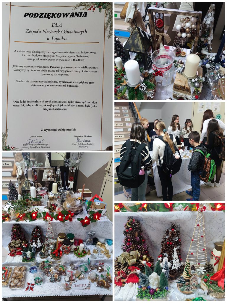 Tuż przed Świętami Bożego Narodzenia (w dniach 19-20 grudnia 2024 r.) Samorząd Uczniowski zorganizował kiermasz świąteczny. Stroiki, kartki, bombki, gipsowe figurki – to tylko niektóre, z licznych ozdób, które można było nabyć. Były również słodkie wypieki: pierniczki i pierniki, które cieszyły się sporym zainteresowaniem kupujących. Jestem pod ogromnym wrażeniem wielkiej aktywności podczas zakupów, a także szczodrości i życzliwości wielu osób. Dochód ze sprzedaży przerósł moje najśmielsze oczekiwania i wyniósł dokładnie 1465,10 zł. Dnia 20 grudnia cała kwota została przekazana na rzecz budowy Hospicjum Stacjonarnego w Wiśniowej. Składam wielkie podziękowania wszystkim osobom, które w jakikolwiek sposób przyczyniły się do zorganizowania i przeprowadzenia kiermaszu.