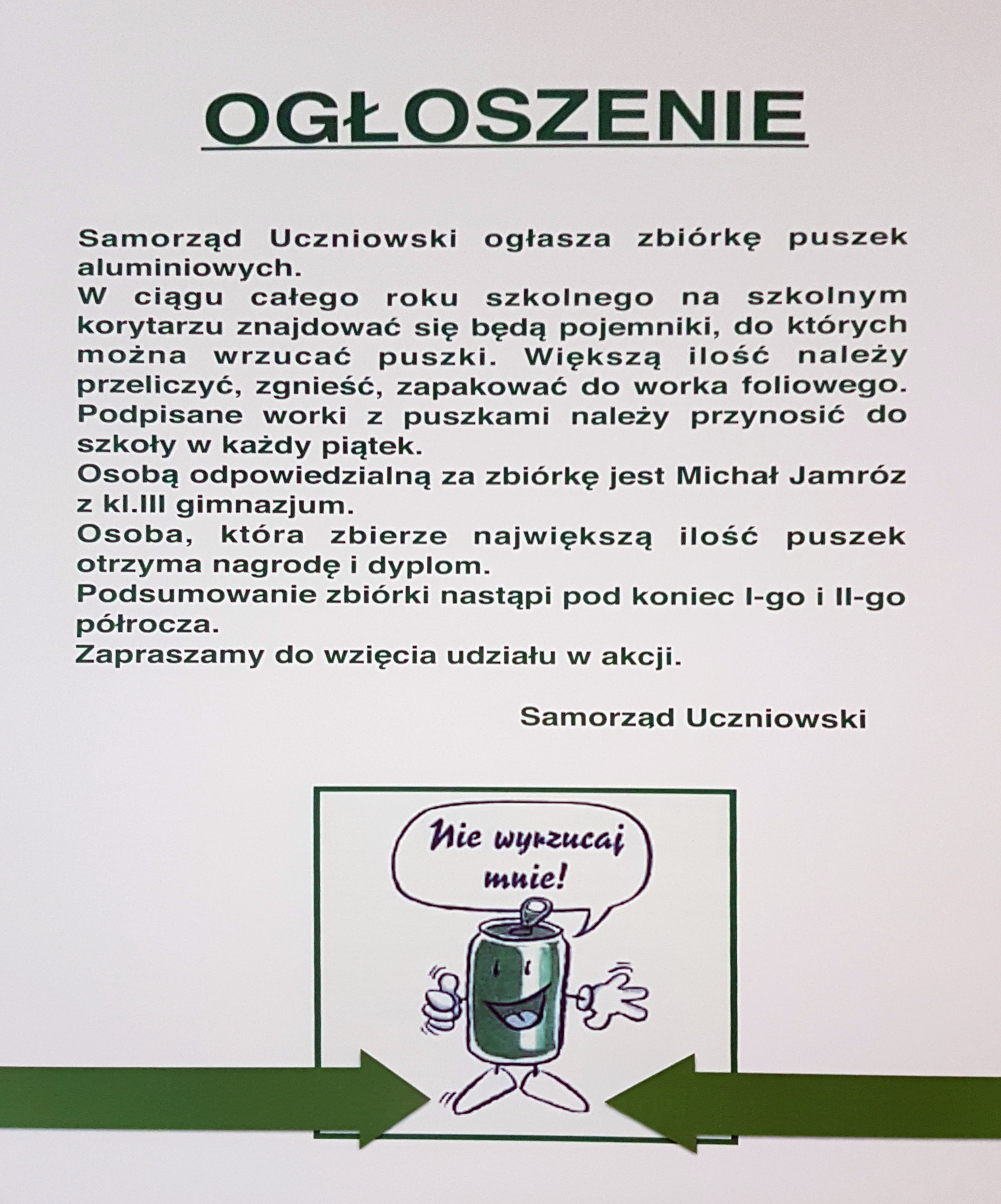 - rozpoczął całoroczną akcję zbiórki puszek aluminiowych,