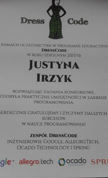 Justyna wzięła udział w konkursie informatycznym dla dziewcząt: DressCode, który trwał od listopada 2015 do maja 2016, a skierowany był do dziewcząt w wieku 11-19 lat zainteresowanych programowaniem. Rozwiązała serię zadań, o zróżnicowanym poziomie trudności – od prostych, po bardziej złożone, wymagające własnego pomysłu, ale dające też dużo satysfakcji. Ich treść była publikowana co 2-4 tygodnie na stronie internetowej „Dress Code”, a dodatkowo przez cały rok szkolny dziewczęta mogły zadawać pytania na założonym przez organizatorów konkursu forum internetowym.