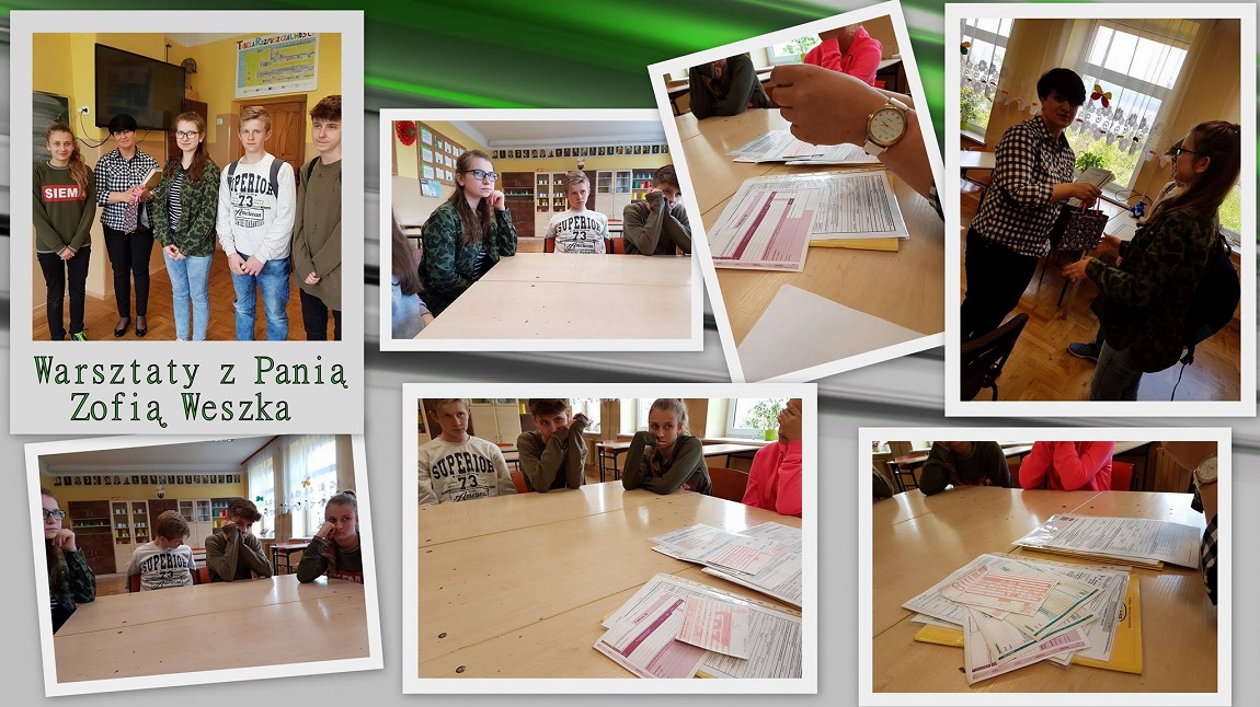 W dniu 9 maja 2017r. na zajęcia Koła Przedsiębiorczości zaproszona została Pani Zofia Weszka, która prowadzi na terenie naszej gminy własne biuro podatkowe. Pani Zofia bardzo szczegółowo przedstawiła uczniom, na czym polega założenie działalności gospodarczej na terenie naszej gminy. Jakie dokumenty należy złożyć i jakie urzędy odwiedzić, aby otworzyć własną działalność gospodarczą. Uczniowie mogli oglądnąć wypełnione dokumenty CEIDG-1, VAT-7, ZUS DRA, PIT-28, PIT-36. Poznali terminy składania tych deklaracji. Dowiedzieli się również, że chcąc prowadzić działalność gospodarczą należy wybrać formę opodatkowania. Do wyboru są m.in.: