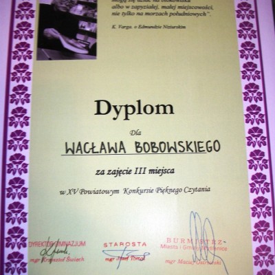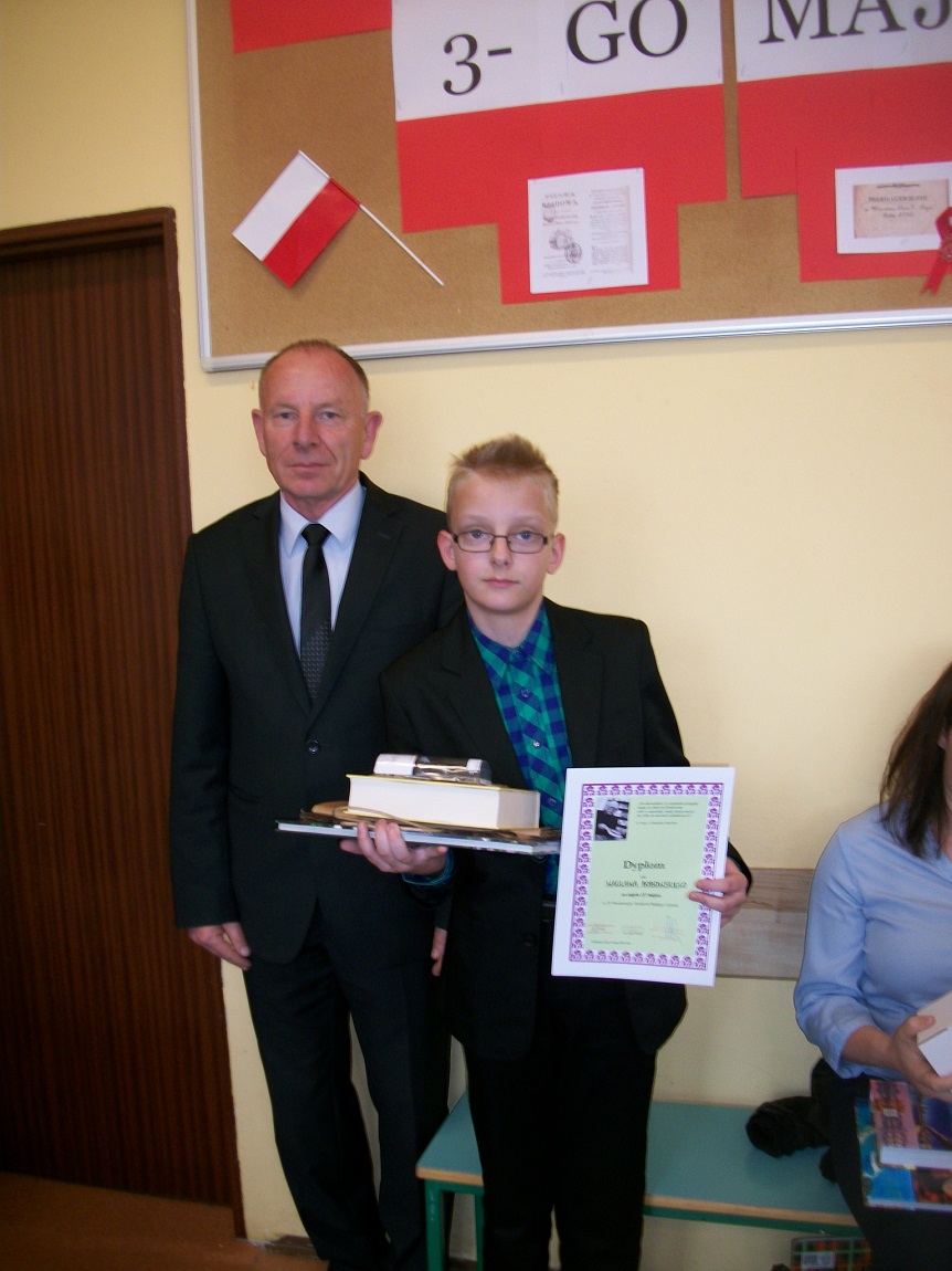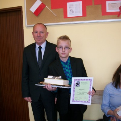 Otrzymał gratulacje, dyplom i nagrody książkowe oraz nagrodę rzeczową z rąk przedstawicielek Starostwa Powiatowego oraz mgr K. Święcha – Dyrektora Gimnazjum nr 2 w Myślenicach.
