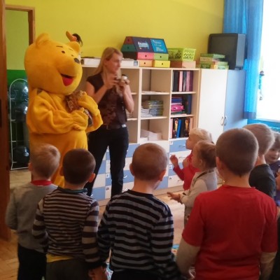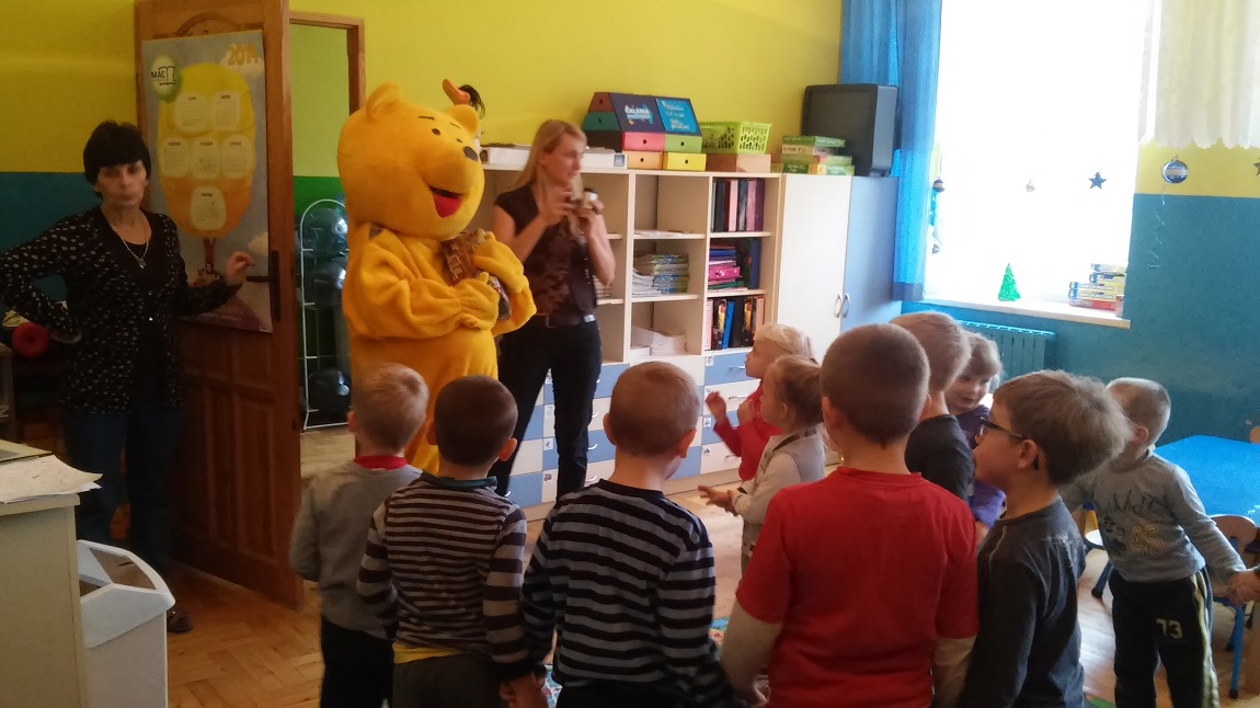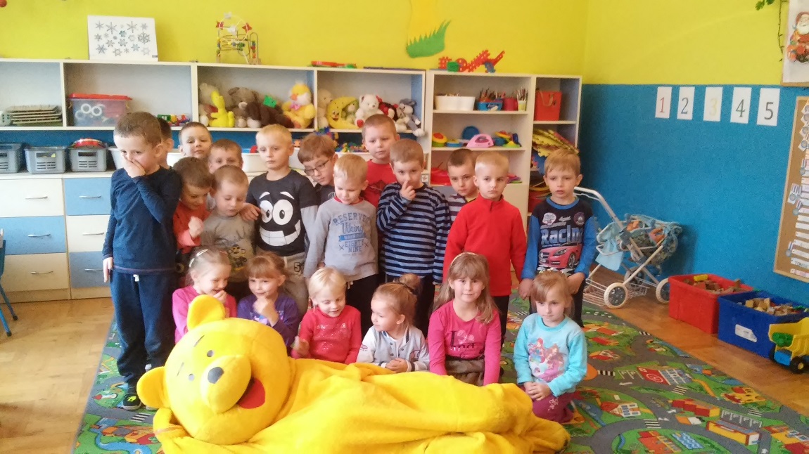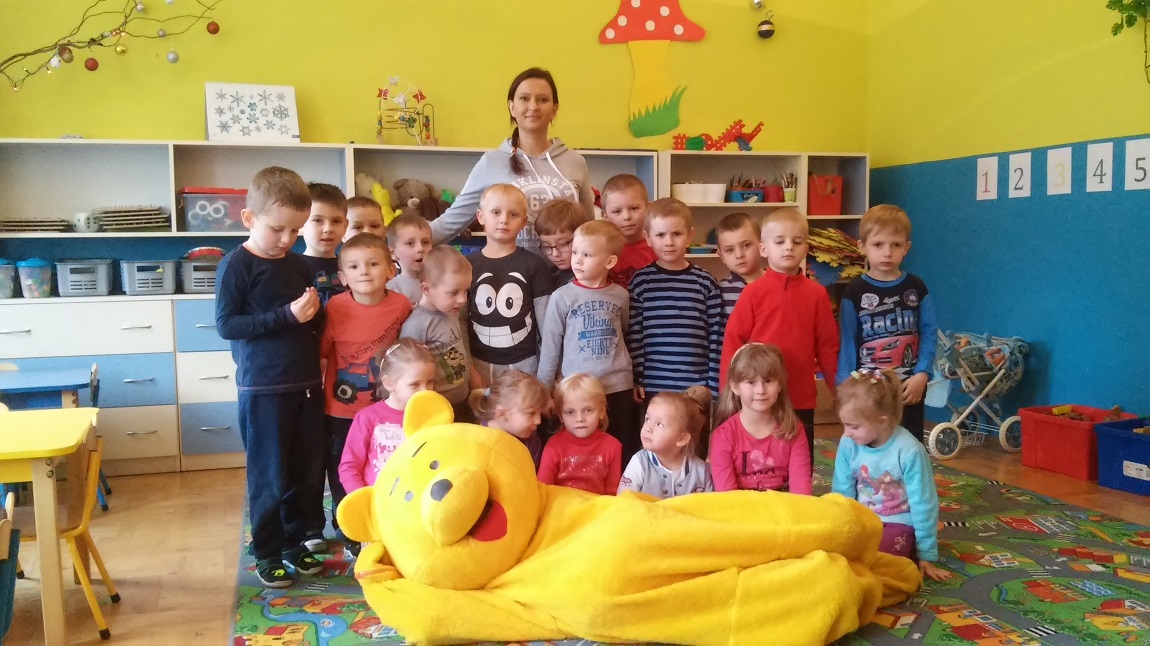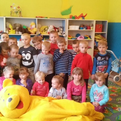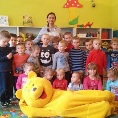 Kubuś Puchatek wybiera się na poszukiwanie miodu. Po drodze odwiedza grupę „Biedronek”. Dzieci bardzo cieszyły się ze spotkania, śpiewały wspólnie z misiem piosenki oraz tańczyły. Z wielką radością uczestniczyły w zabawie pt. :”Muzyczna paczka”. Po rozpakowaniu zawartości prezentem były słodycze. Dzieci nie chciały wypuścić misia ze sali więc na pamiątkę zrobiliśmy kilka wspólnych zdjęć.