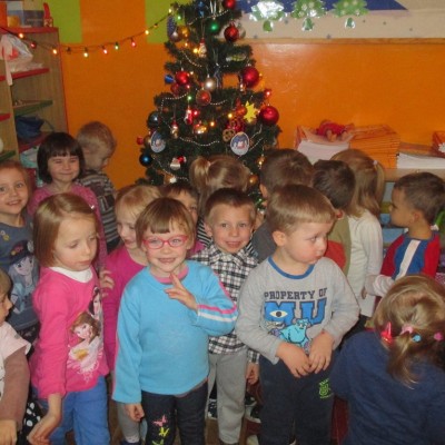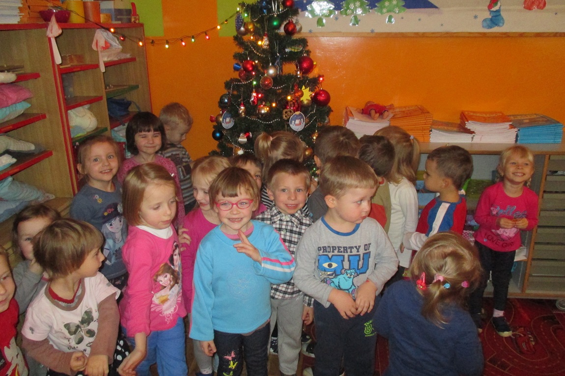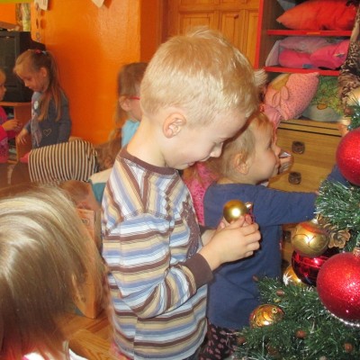 Czekając na spotkanie z Mikołajem, dzieci z grupy przedszkolnej – „Pszczółki” wspólnie z p. Anią ubrały świąteczną choinkę. Sprawne rączki zawieszały na gałęziach kolorowe bombki, łańcuchy, a po chwili zamrugały też maleńkie lampki. Żeby długo wyczekiwany gość był wesoły i by było mu przyjemnie, dzieci z pomocą p. Janusza przygotowały dla Niego piosenki i solidny tron, żeby Mikołaj mógł wygodnie porozdawać grzecznym dzieciom prezenty.
