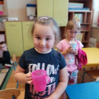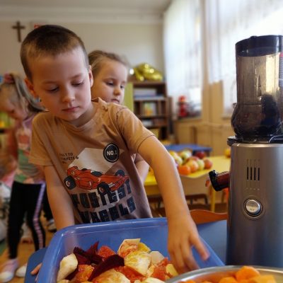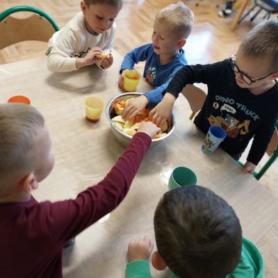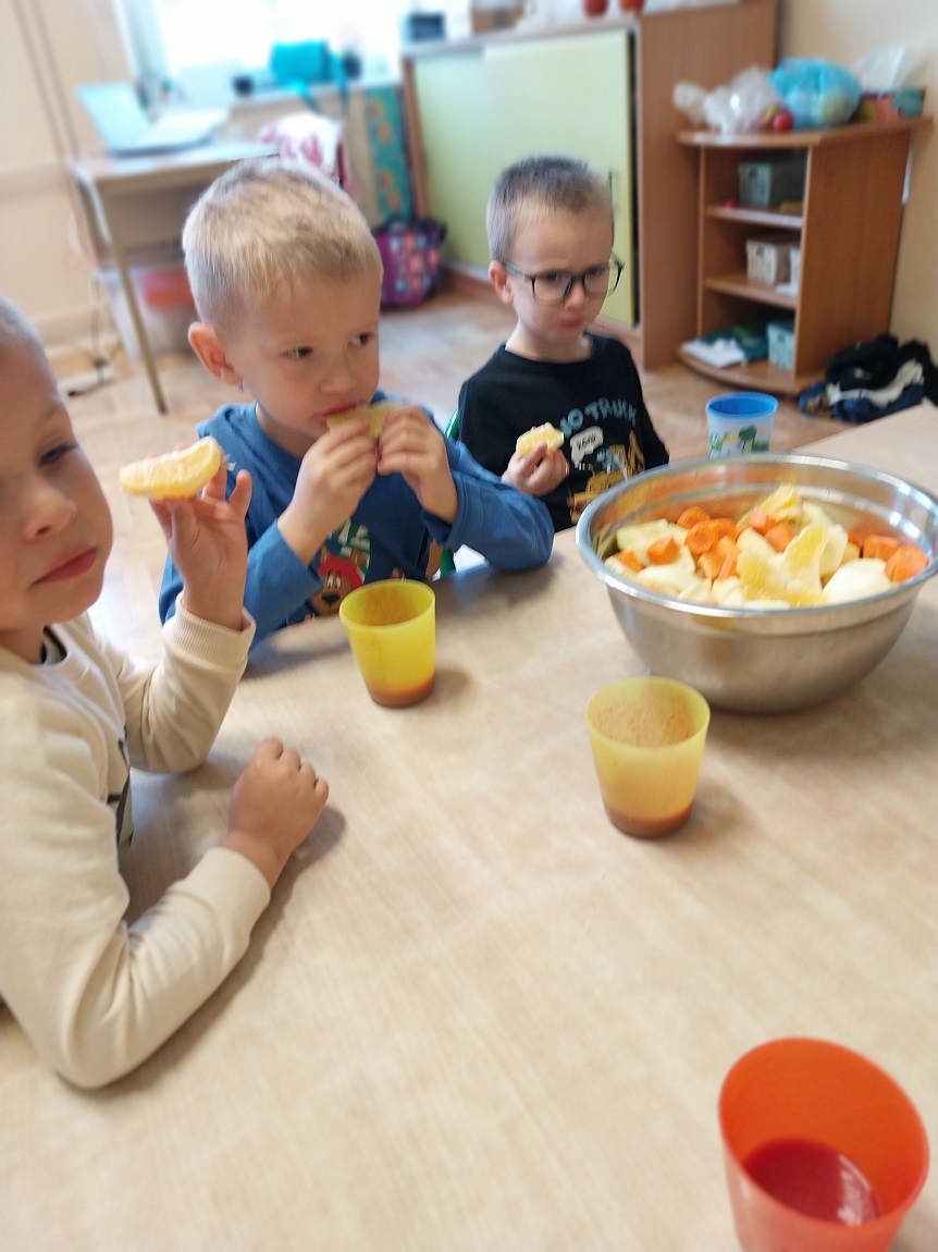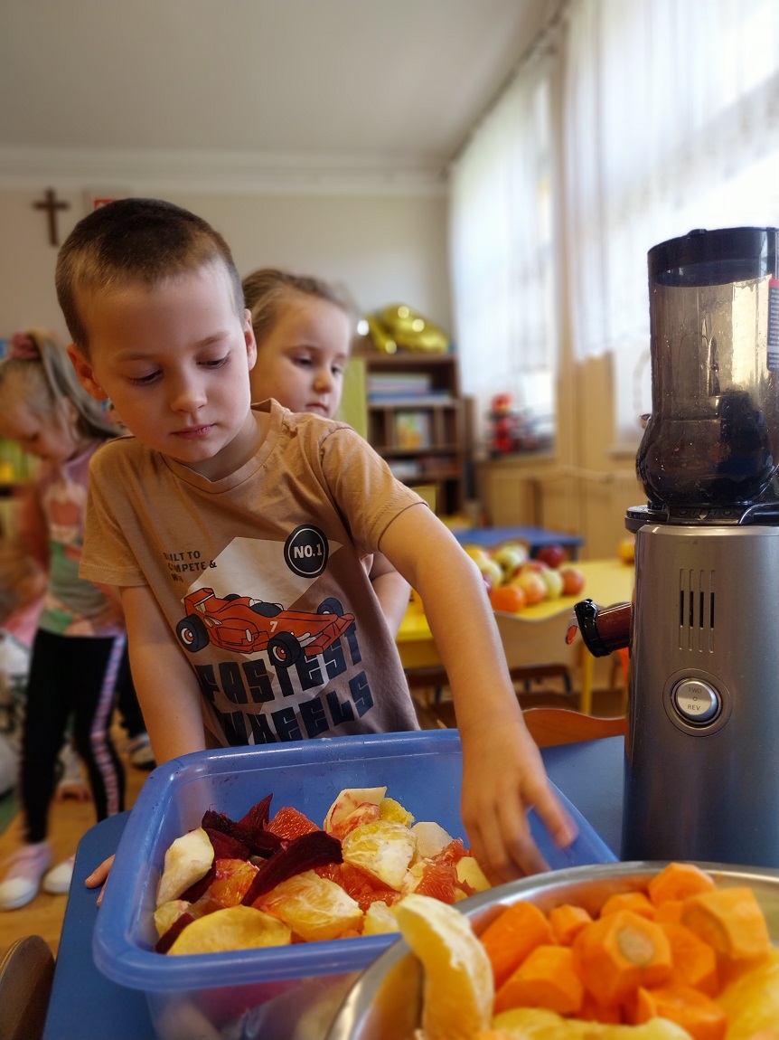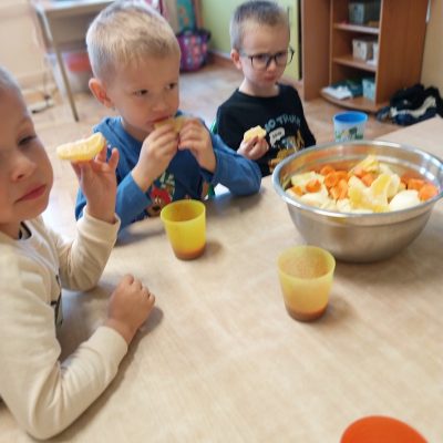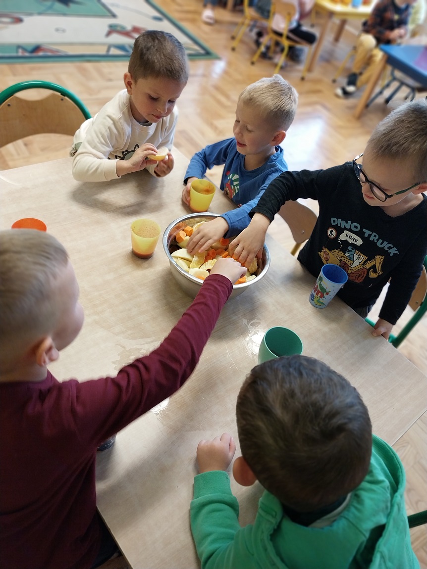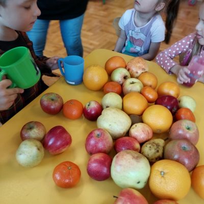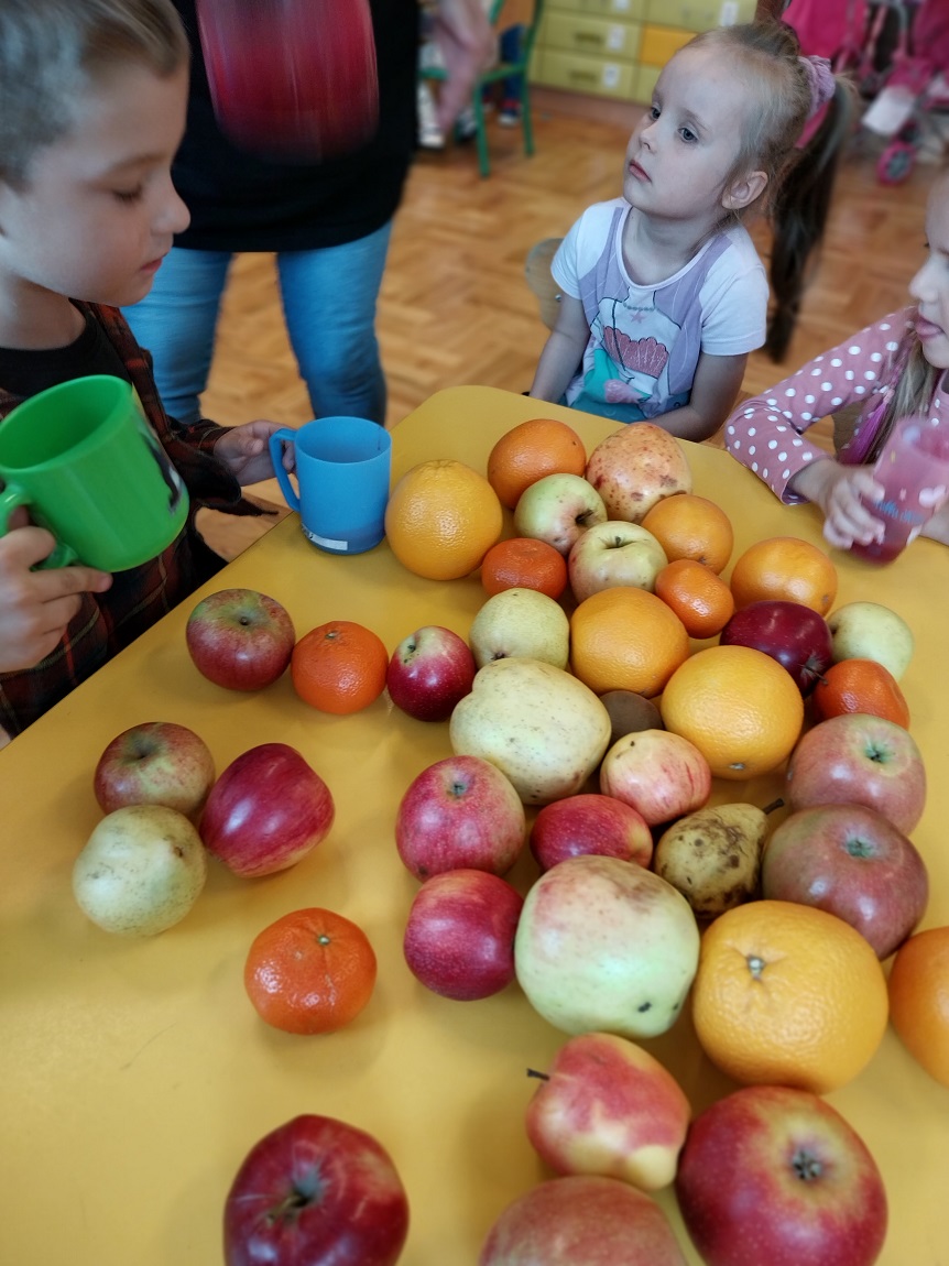 W dniu 23. września w grupie „Pszczółek” dzieci w trakcie zajęć utrwaliły nazwy owoców. Dokonały analizy słuchowej słowa „owoce”. Tworzyły zbiory owoców pod względem nazwy, kształtu, wielkości oraz koloru. Podkreśliły wartość jedzenia owoców i warzyw w tak młodym wieku. Uczestniczyły w zabawie ruchowej „Sałatka owocowa”. A na końcu przystąpiły do degustacji owoców, a także soku, który sami wykonali zachowując zasady bezpieczeństwa i higieny.