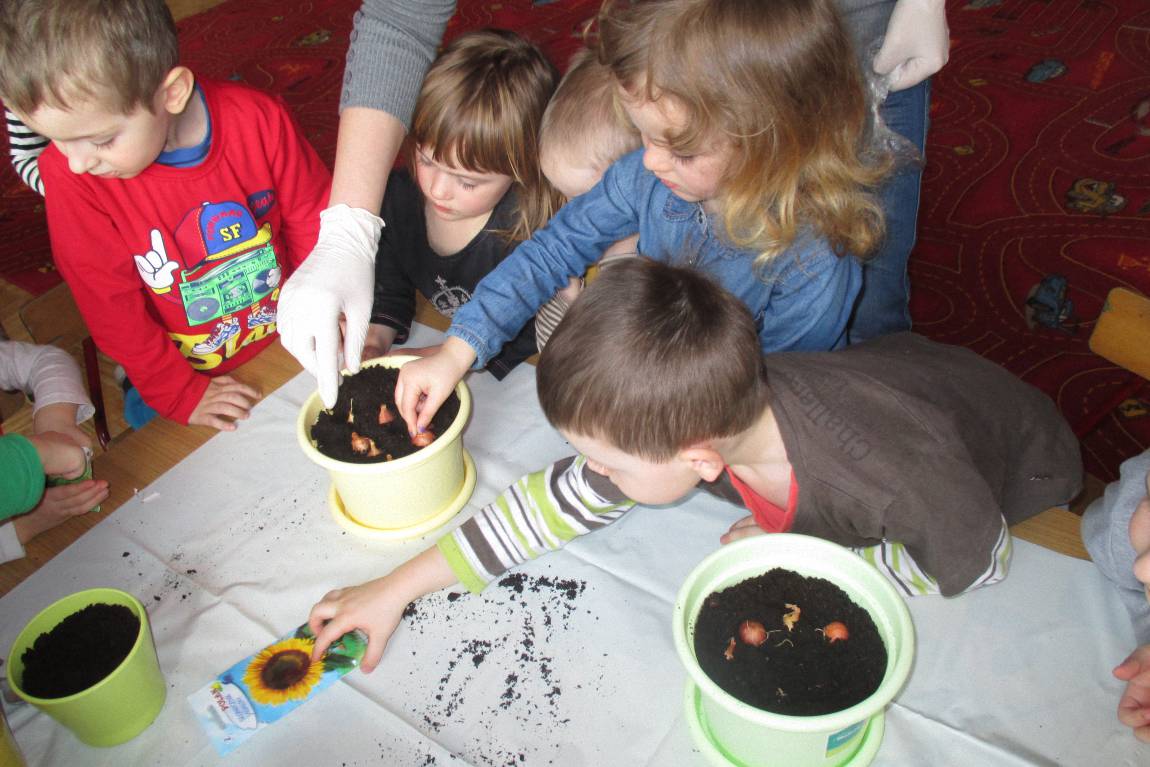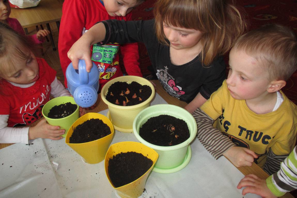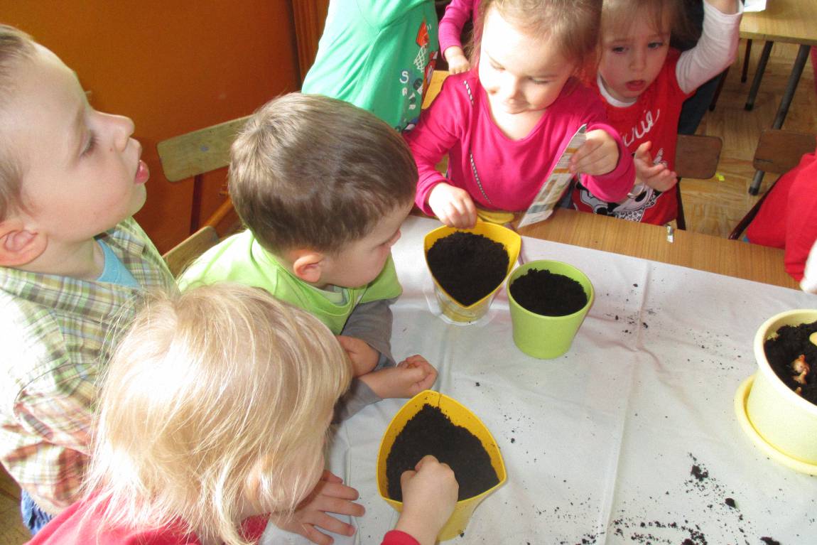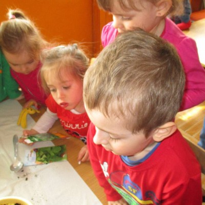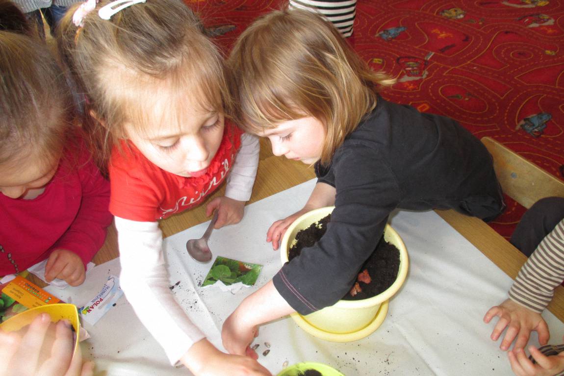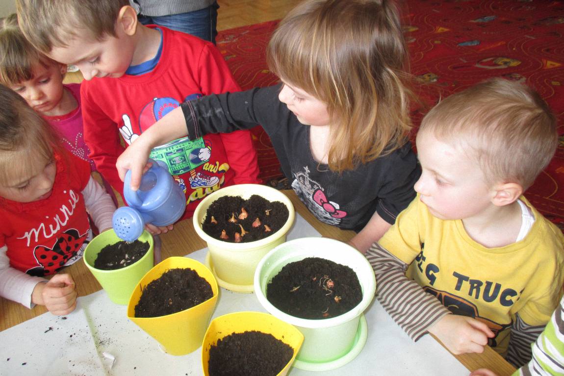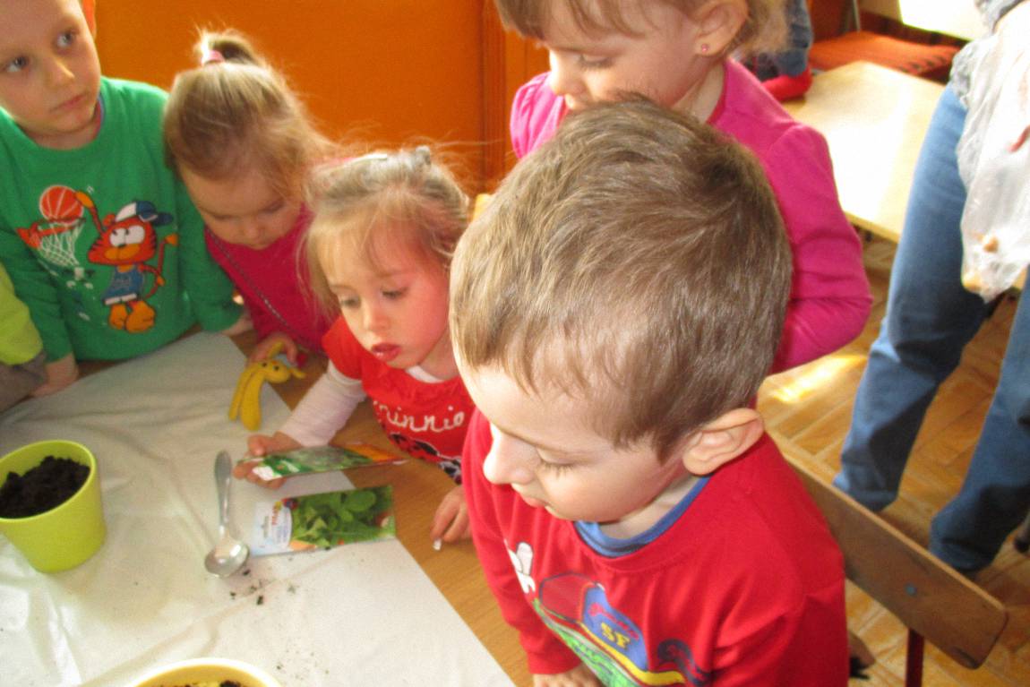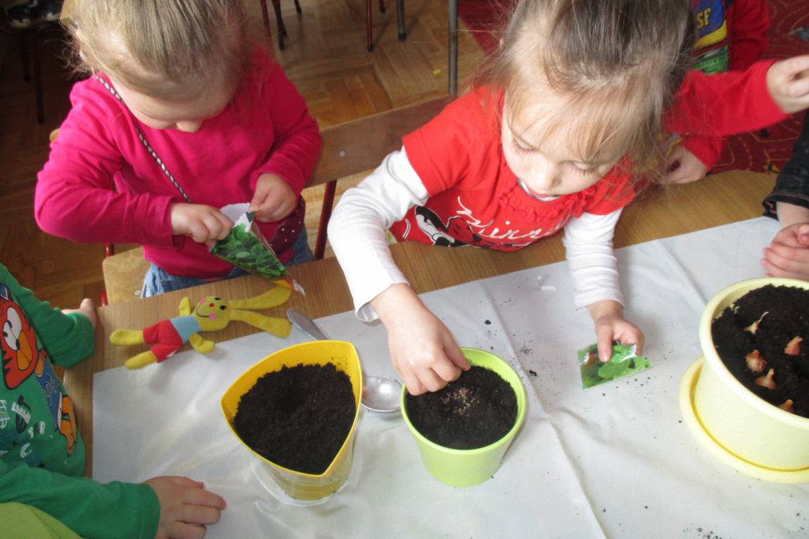 „Pszczółki” witają wiosnę w każdym niemal dniu pobytu w przedszkolu. Dziś wspólnie z wychowawczynią dzieci założyły zielony ogródek na parapecie okiennym. W przygotowanych kolorowych doniczkach posadziły nasionka rukoli, bazylii, majeranku, tymianku, pietruszki naciowej, nasionka słonecznika oraz cebulkę – dymkę. Na wielkanocny stół zamierzają wyhodować ozdobny owiesek i pachnącą rzeżuchę. Wszystkie te roślinki kochają słońce i dobrze znoszą warunki panujące w mieszkaniu, dlatego też dzieci mają nadzieję, że niebawem będą mogły oglądać, a także czuć zapach tych „zielonych gości” w przedszkolnej sali.