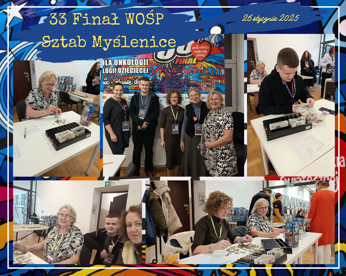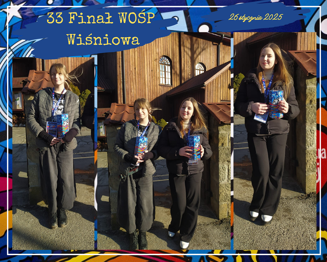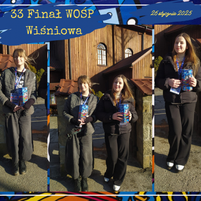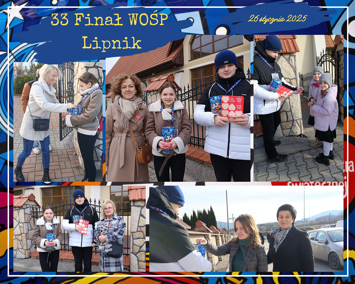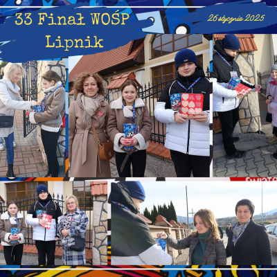 W dniu 26 stycznia 2025r. dziesięciu uczniów naszej szkoły i jeden absolwent było wolontariuszami Wielkiej Orkiestry Świątecznej Pomocy. Od wczesnych godzin porannych uczniowie: Emilia Flaga z kl. 6, Klaudia Lenart z kl. 7b, Kinga Tokarz z kl. 7a, Michał Florek z kl. 7a, Jakub Irzyk z kl. 7a, Mikołaj Nalepa z kl. 7a, Szymon Murzyn z kl. 7a, Karolina Zielińska z kl. 8, Gabriela Bajer z kl. 8, Gabriela Lenart z kl. 8 i Filip Kucała zbierali pieniądze przy kościołach w Lipniku, Wiśniowej, Węglówce, Trzemeśni, Porębie, Osieczanach i Drogini. Po południu, w sztabie w Myślenickim Domu Kultury i Sportu p. Barbara Kirzeniewska i p. Urszula Kucała liczyły pieniądze zbierane przez wolontariuszy z powiatu myślenickiego. Dla naszych uczniów była to bardzo pracowita niedziela. W tym roku WOŚP zbierała środki  dla onkologii i hematologii dziecięcej. Hasło 33. Finału to „Gramy na zdrowie!”.