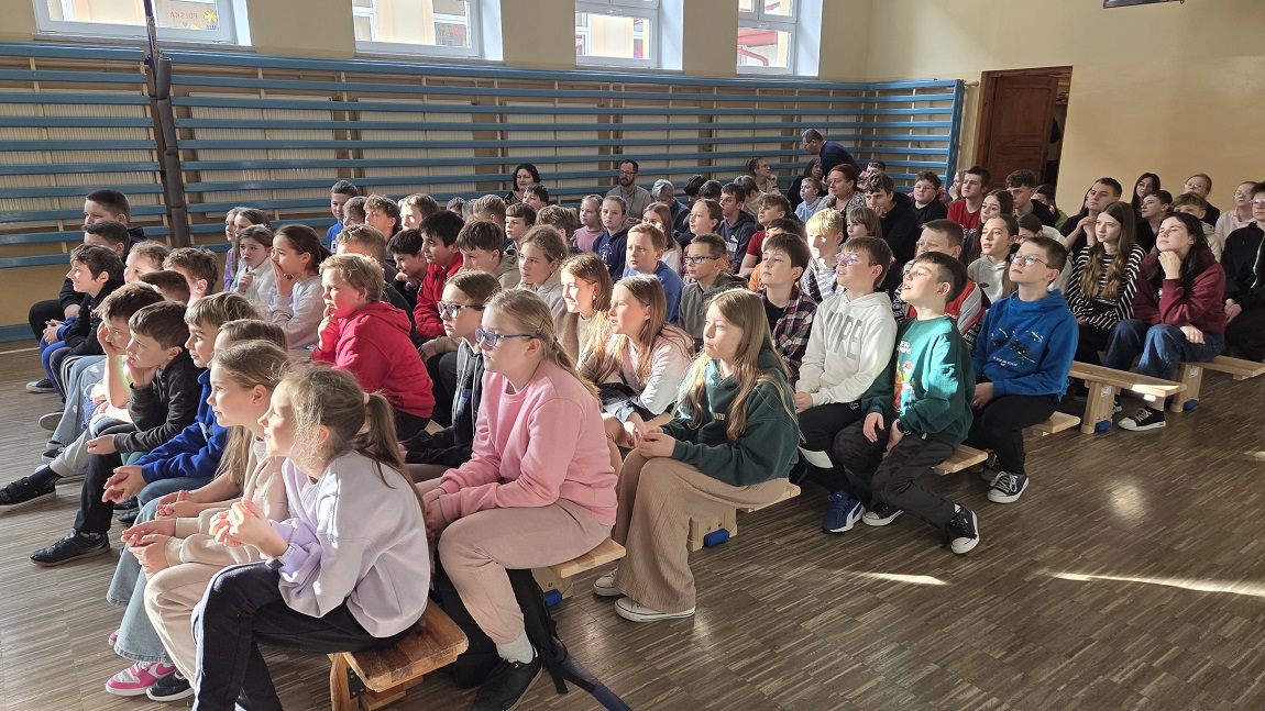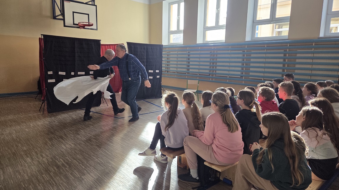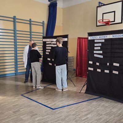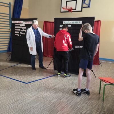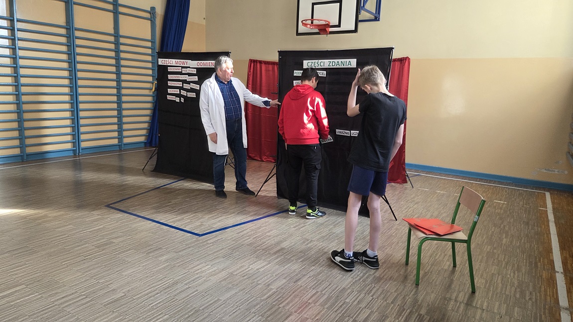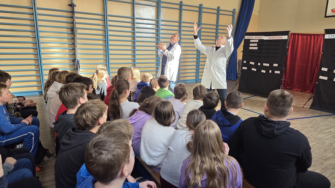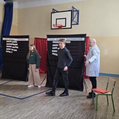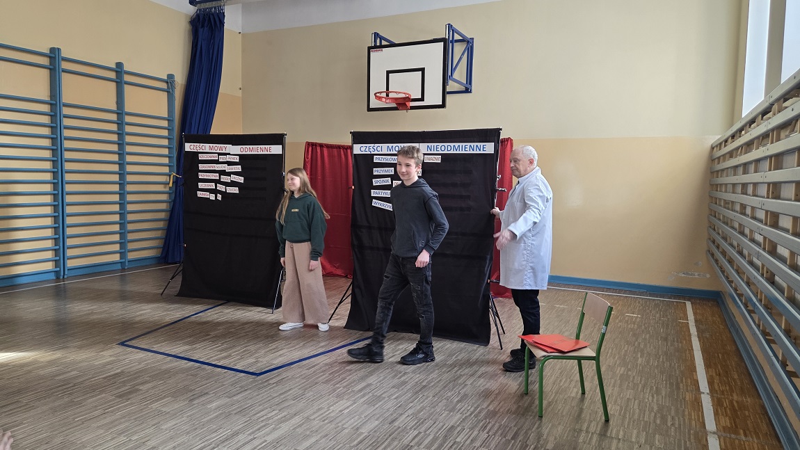 Dialog był przeplatany tekstami z literatury ilustrującymi omawiane części mowy. W trakcie występu pojawiły się zagadki dotyczące tajników gramatyki polskiej. Uczniowie świetnie się bawili, rozwiązując poszczególne zadania.
