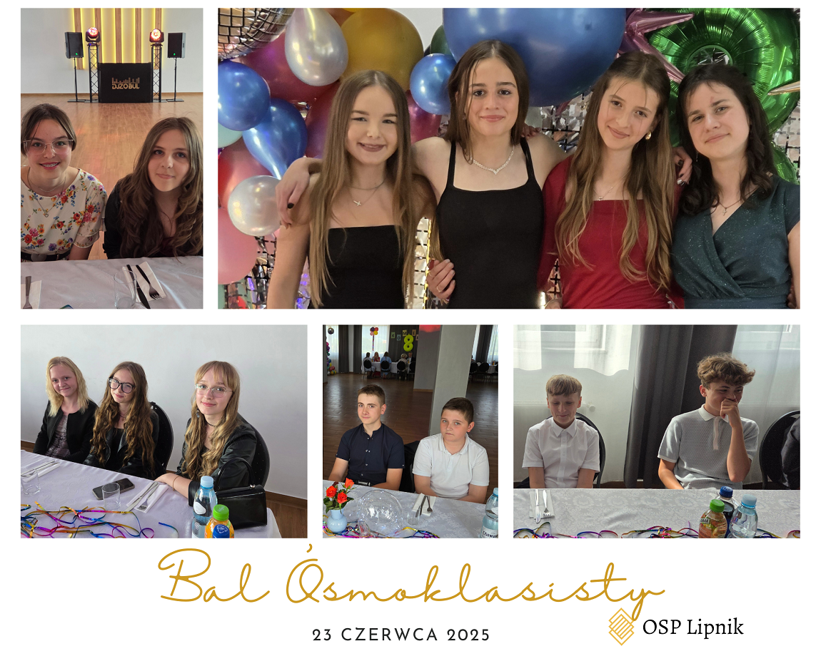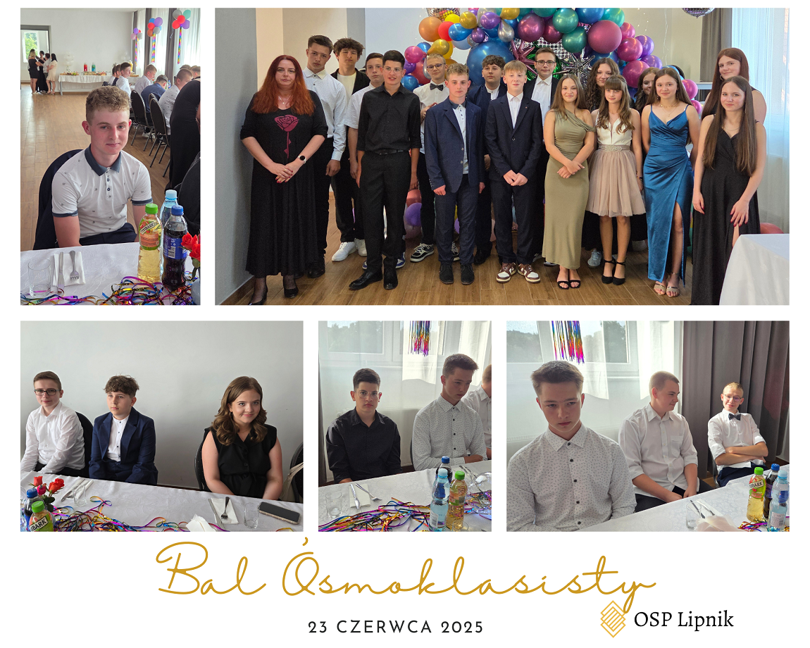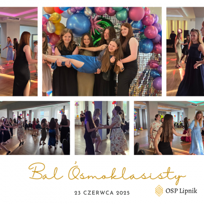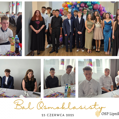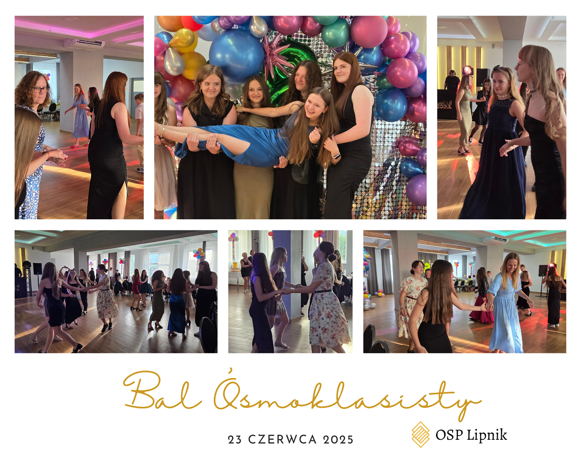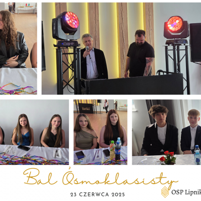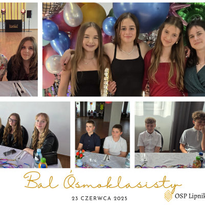 W dniu 23 czerwca 2025r. uczniowie klasy VIII wspólnie z uczniami klasy VIIa i VIIb bawili się na Balu Ósmoklasisty, który odbył się w budynku Ochotniczej Straży Pożarnej w Lipniku. Zabawę i poczęstunek przygotowali Rodzice uczniów klasy VIII. Czas umilał DJ. Na Bal zaproszeni zostali również nauczyciele i pracownicy szkoły. Wszyscy świetnie się bawili do późnych godzin.