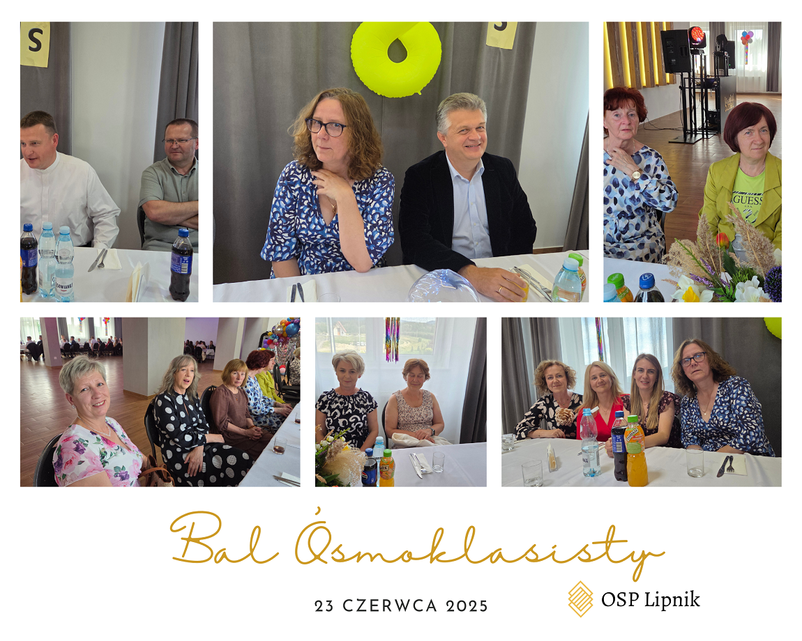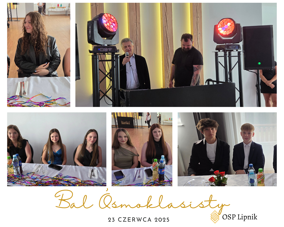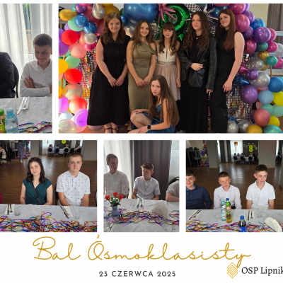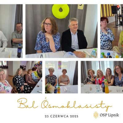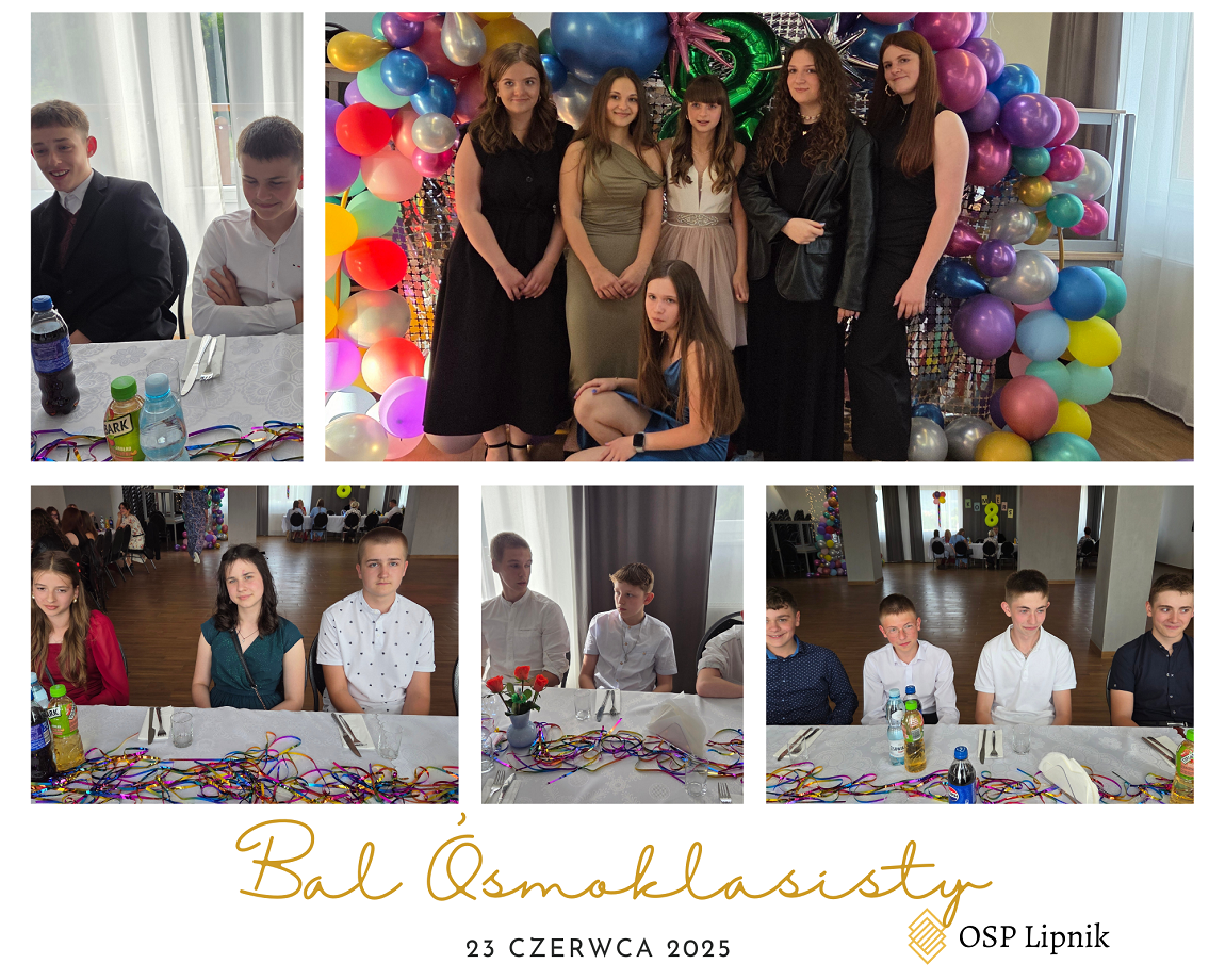 W dniu 23 czerwca 2025r. uczniowie klasy VIII wspólnie z uczniami klasy VIIa i VIIb bawili się na Balu Ósmoklasisty, który odbył się w budynku Ochotniczej Straży Pożarnej w Lipniku. Zabawę i poczęstunek przygotowali Rodzice uczniów klasy VIII. Czas umilał DJ. Na Bal zaproszeni zostali również nauczyciele i pracownicy szkoły. Wszyscy świetnie się bawili do późnych godzin.