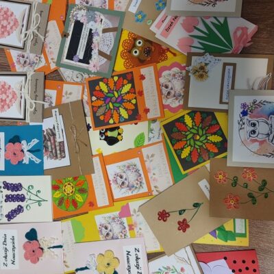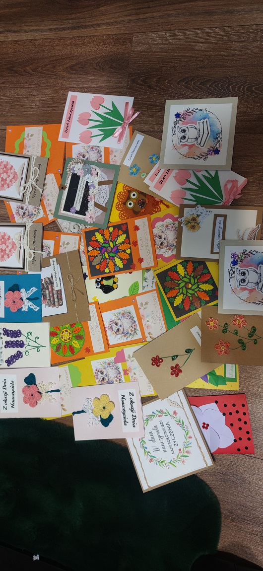 Nie zabrakło również upominków – Samorząd Uczniowski wręczył drobne prezenty wszystkim Pracownikom Szkoły, a także przygotował kartki z życzeniami dla naszych emerytowanych Nauczycieli i Pracowników, którzy zawsze pozostają częścią naszej szkolnej rodziny.