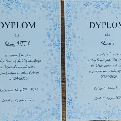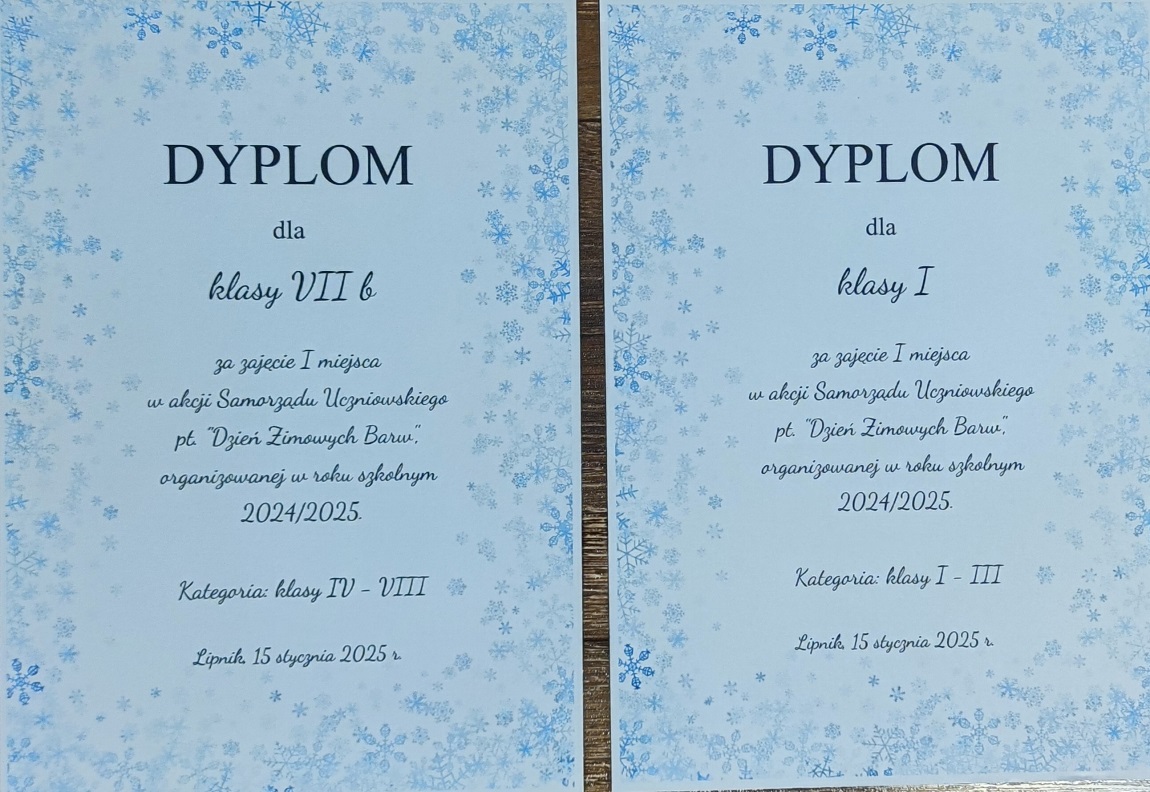 W dniu 15 stycznia 2025 r. w naszej szkole zrobiło się bardzo zimowo. Uczniowie poczuli z pewnością atmosferę zbliżających się ferii zimowych ponieważ w tym dniu Samorząd Uczniowski przeprowadził akcję pt. „Dzień Zimowych Barw”. W tym dniu każdy uczeń miał ubrać się na biało lub niebiesko. W klasach I – III zwyciężyła klasa I, gdzie 100% osób obecnych w tym dniu było ubranych w zimowe barwy. W klasach starszych zwyciężyli uczniowie klasy VII B. W tej klasie również wszyscy ubrani byli na biało lub niebiesko. Nagrodami dla zwycięskich klas były słodkie upominki oraz pamiątkowe dyplomy.