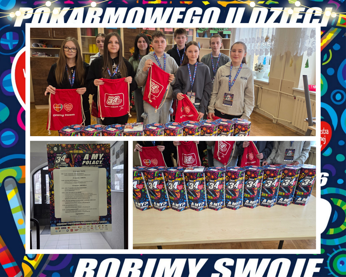 W dniu 22 stycznia 2026r. jedenastu uczniów naszej szkoły odebrało puszki, serduszka, identyfikatory, które wykorzystają podczas niedzielnego 34 Finału WOŚP. Naszych uczniów spotkać będzie można przy kościołach w Lipniku, Wiśniowej, Węglówce, Trzemeśni, Porębie i Osieczanach. W tym roku WOŚP zbiera pieniądze na zakup sprzętu do diagnostyki i leczenia chorób przewodu pokarmowego u najmłodszych pacjentów.