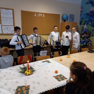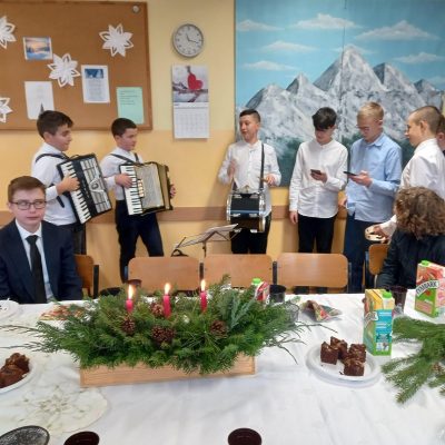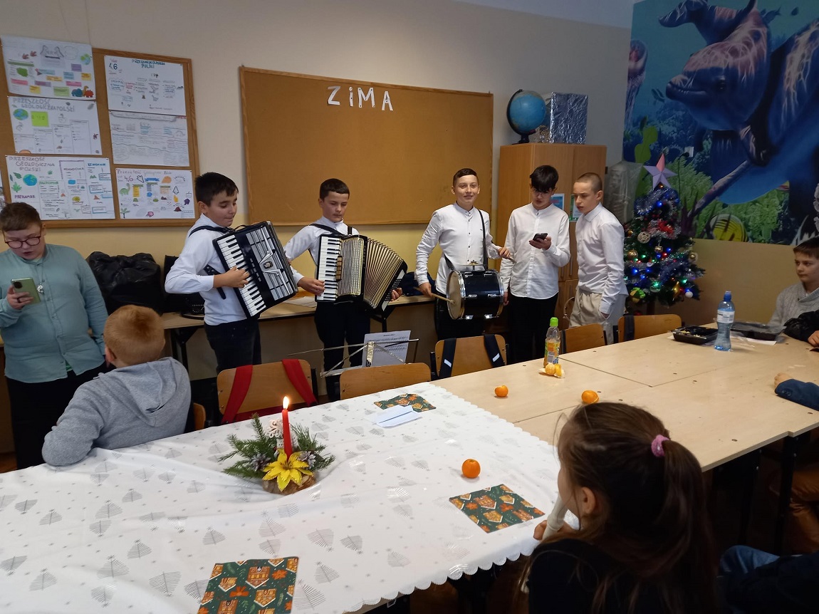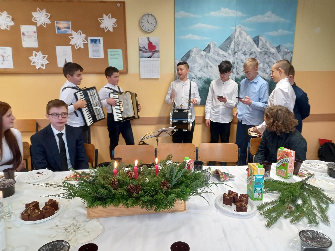 20 grudnia przed Świętami Bożego Narodzenia uczniowie z kl.  V, VII A i VIII odwiedzili klasy i ich wychowawców. Uczniowie w składzie: Jakub Irzyk kl. VII A – akordeon, Jakub Jasek kl. V – akordeon, Arkadiusz Szymoniak kl. VIII –  bęben,  Błażej Murzyn kl. VII A-  tamburyn, Ksawery Sędzik, Jan Raczek, Tomasz Urbanik, Jakub Bucki z kl.VIII grali i śpiewali tradycyjne kolędy.