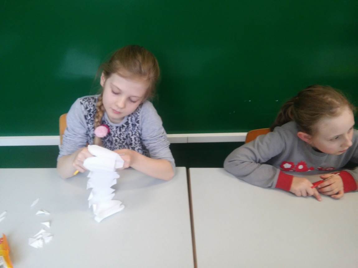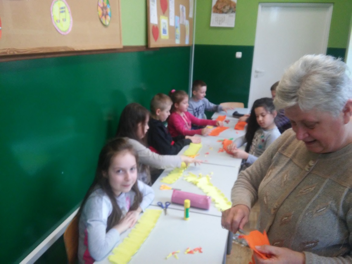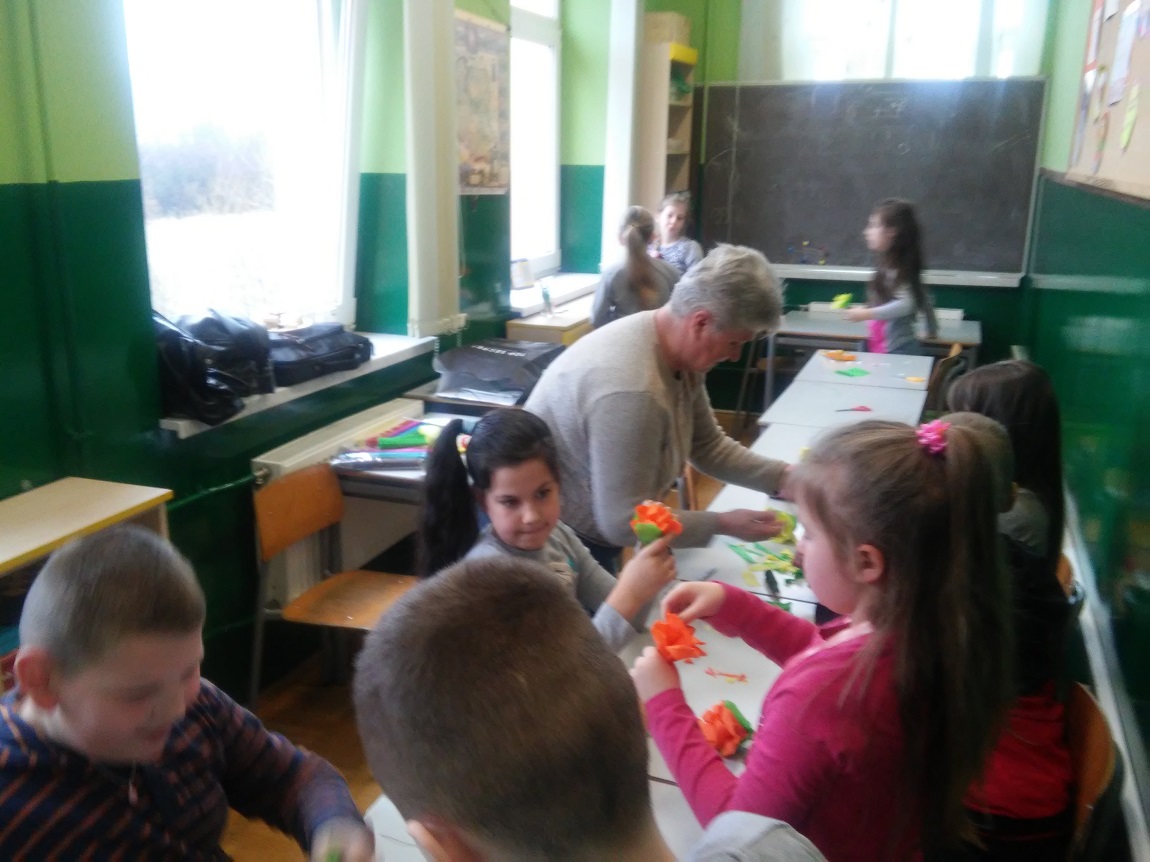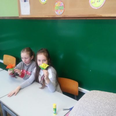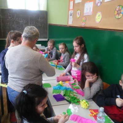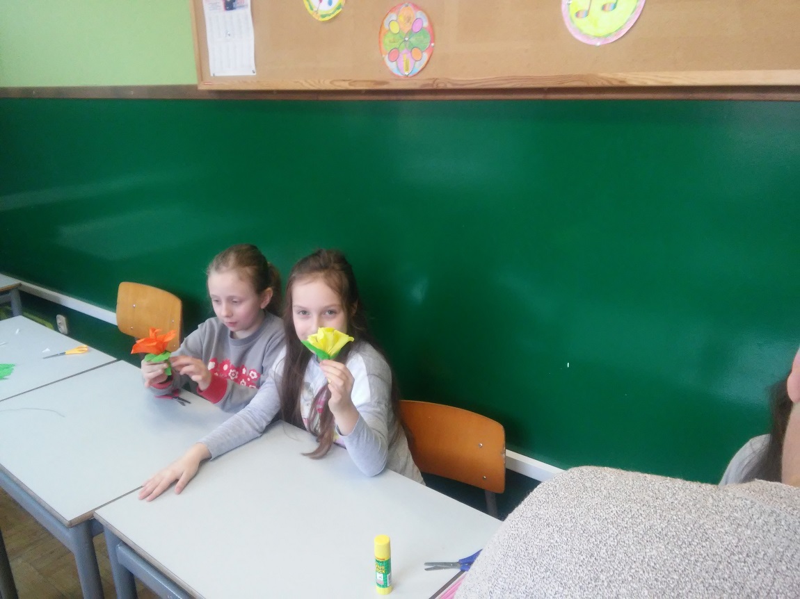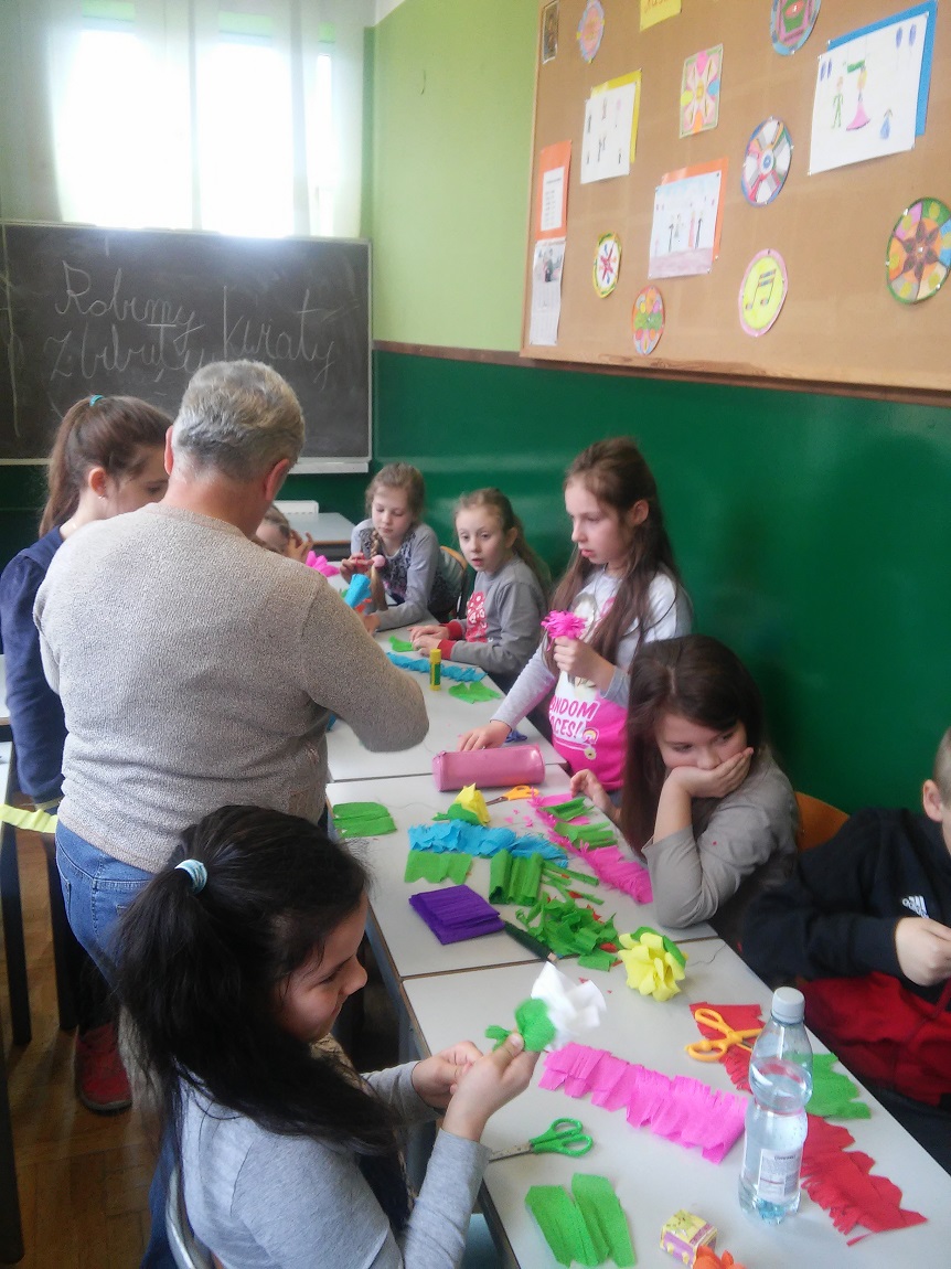 Dnia 6 marca 2017r. na zajęciach świetlicy szkolnej, pełną parą ruszyły przygotowania do Międzynarodowego Święta Kobiet. Gościem specjalnym była Pani Czesława Kowalczyk, która zechciała podzielić się z dziećmi jedną ze swoich pasji. Uczniowie klasy 3b wraz z opiekunem, pamiętając o zbliżającym się święcie kobiet, wpadli na pomysł wykonania bukietów sztucznych kwiatów. Spotkanie rozpoczęło się pokazem kunsztu P. Kowalczyk. Następnie wszyscy przystąpili do indywidualnej pracy, w czasie której niezbędne okazały się wskazówki zaproszonego gościa. Radości było co nie miara, a czas zajęć upłynął niepostrzeżenie. Na szczęście każdemu udało się wykonać co najmniej jeden kwiat z bibuły, który będzie mógł podarować 8 marca. Dziękujemy.
