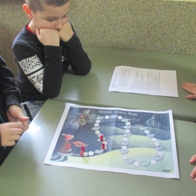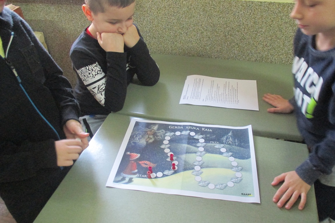 Zima wielu czytelnikom kojarzy się z baśnią H. Ch. Andersena „Królowa Śniegu”, dlatego też uczniowie klasy II A odbyli tajemniczą podróż z wieloma niespodziankami przez labirynt Królowej Śniegu, której tematem przewodnim była przyjaźń. Na drodze wyprawy uczniowie odnaleźli lustro – tajemniczy przedmiot z pierwszego opowiadania baśni, które po złożeniu z kawałków ukazało ważne słowa określające przyjaźń. Z magicznego pudełka za pomocą dotyku dzieci odgadły przedmioty, jakie określiły cechy: ciepłe i puchate. Uczniom złożone zostały życzenia wielu przyjaźni takich ciepłych, jak te przedmioty oraz lojalnych i oddanych przyjaciół. Uczniowie zostali zaproszeni do gry planszowej „Gerda szuka Kaja”, w której w trzyosobowych zespołach dotarli do mety, czyli pałacu Królowej Śniegu.