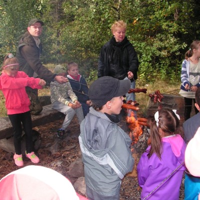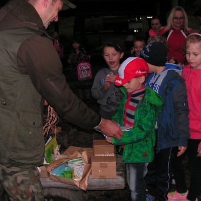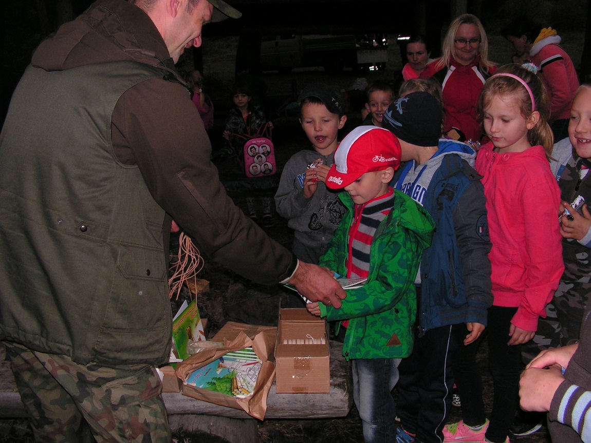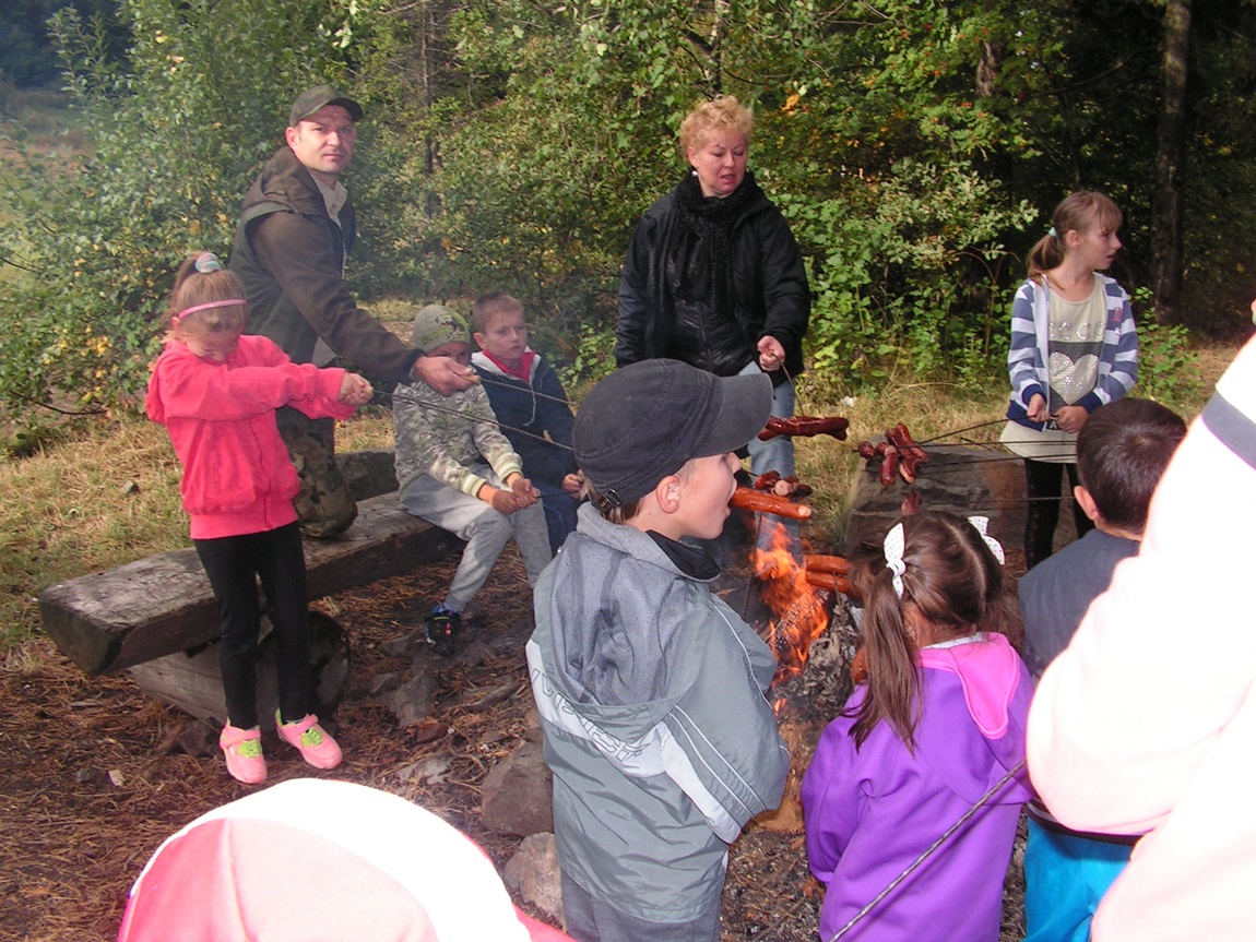 Po wysłuchaniu prelekcji dzieci zadawały panu leśniczemu pytania, a potem z pomocą dorosłych piekły przy ognisku kiełbaski oraz uczestniczyły w zabawach i grach terenowych.