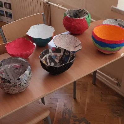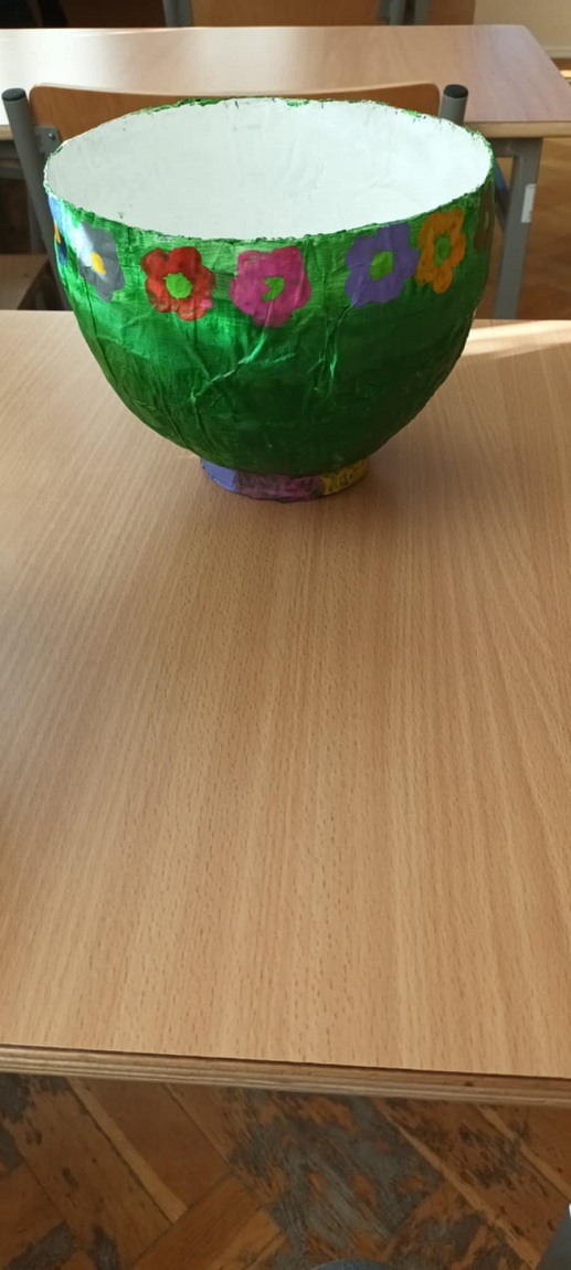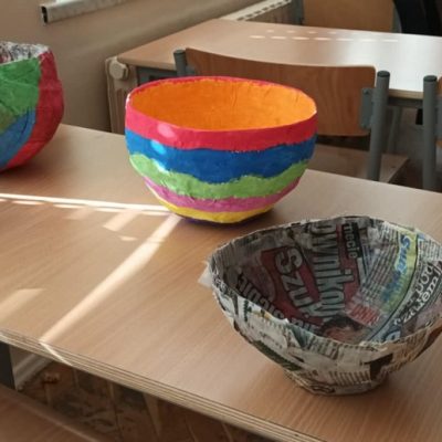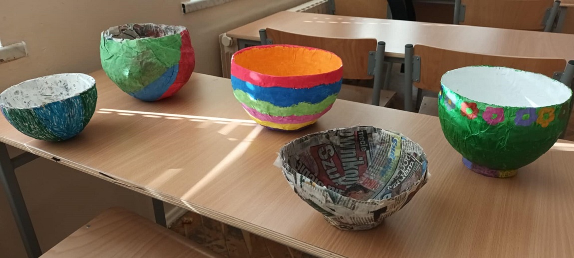 W naszej szkole na lekcjach techniki młodzież rozwija swoje talenty i tworzy ciekawe prace. Klasa V wykonała miskę z papieru metodą papier mache. Uczniowie poznali tą metodę wykonali naczynie, a następnie pomalowali je w dowolny sposób. Efekty prac uczniów przedstawiają poniższe zdjęcia.