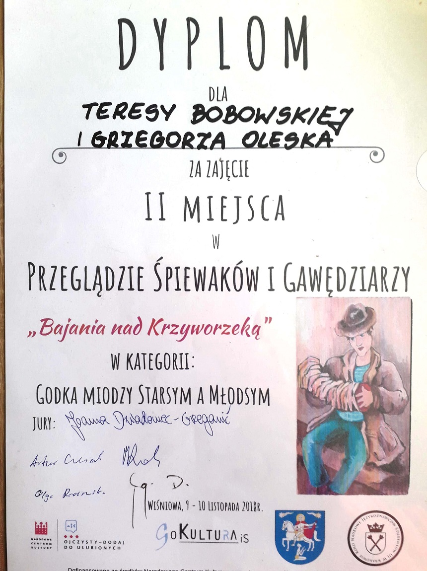 10.11.2018 r. reprezentacja ZPO w Lipniku w składzie: Grzegorz Olesek kl. VII A i T. Bobowska – opiekun – uczestniczyli w Przeglądzie Śpiewaków i Gawędziarzy „Bajania nad Krzyworzeką” – kategoria: Mistrz i Uczeń – Godka miodzy starsym a młodsym.