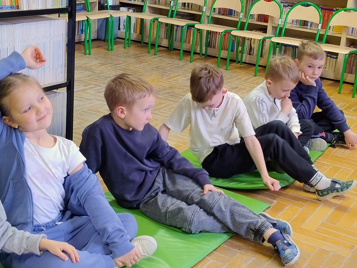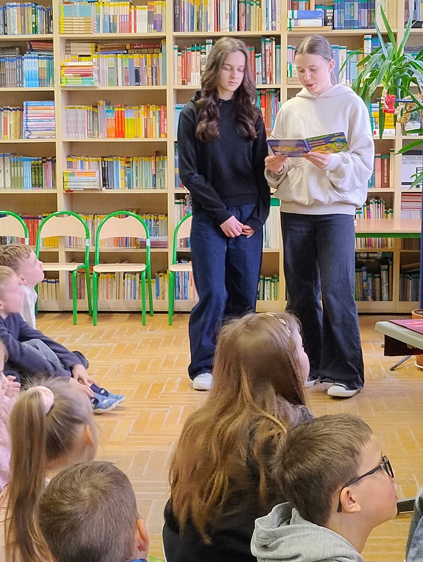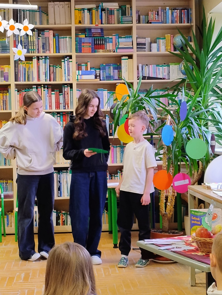 Kolorowy i pachnący tchnieniem wiosny świat odkryły dzieci z przedszkolnej grupy „O” podczas spotkania w szkolnej bibliotece. Uczennice z klasy VII: Anna i Małgorzata w atrakcyjny sposób zaprezentowały literaturę dziecięcą, ukazującą świat kolorów między innymi w wierszach  Marii Konopnickiej, Jana Brzechwy czy Juliana Tuwima. Dzieci udowodniły znajomość  kolorów odpowiadając na niełatwe zagadki, obejrzały inscenizację wiersza  „Entliczek – pentliczek w wykonaniu starszych koleżanek, a eksperymenty z kolorami powiodły ich do otaczającego nas świata, ukazanego w wierszach dla dzieci.