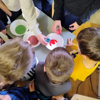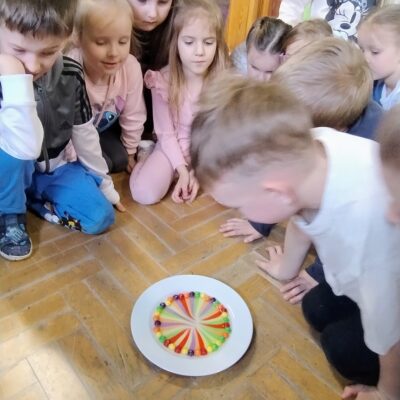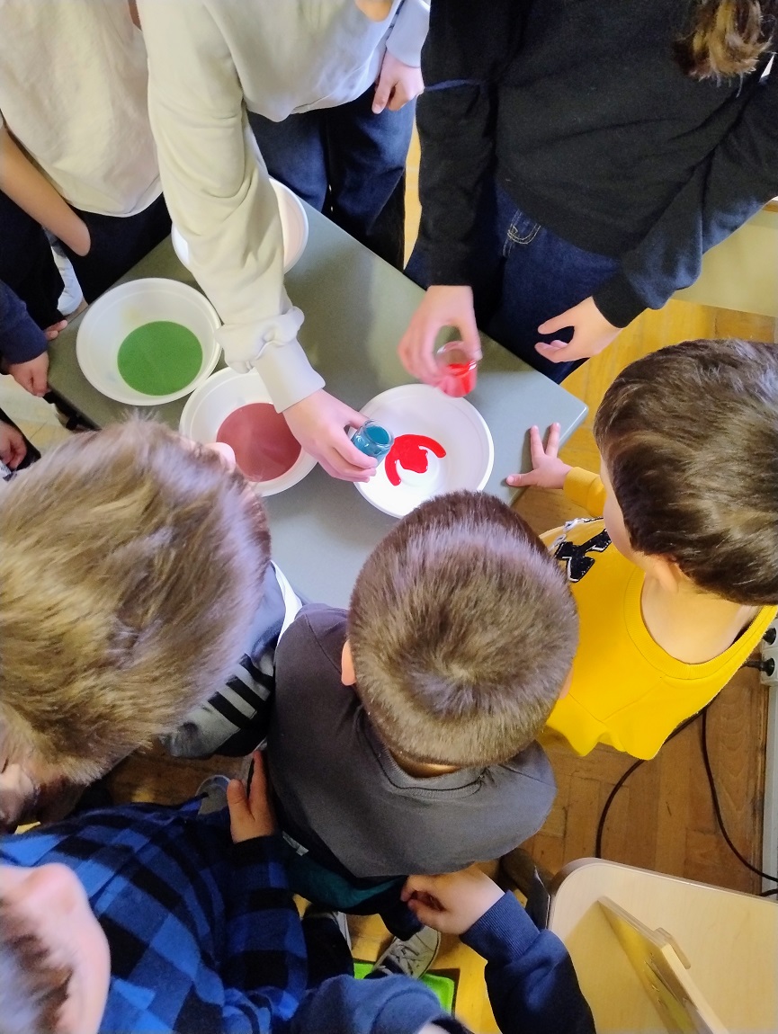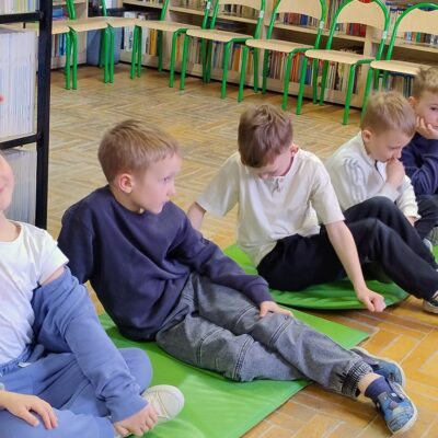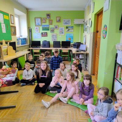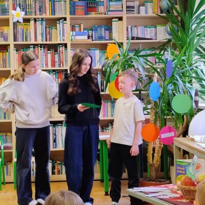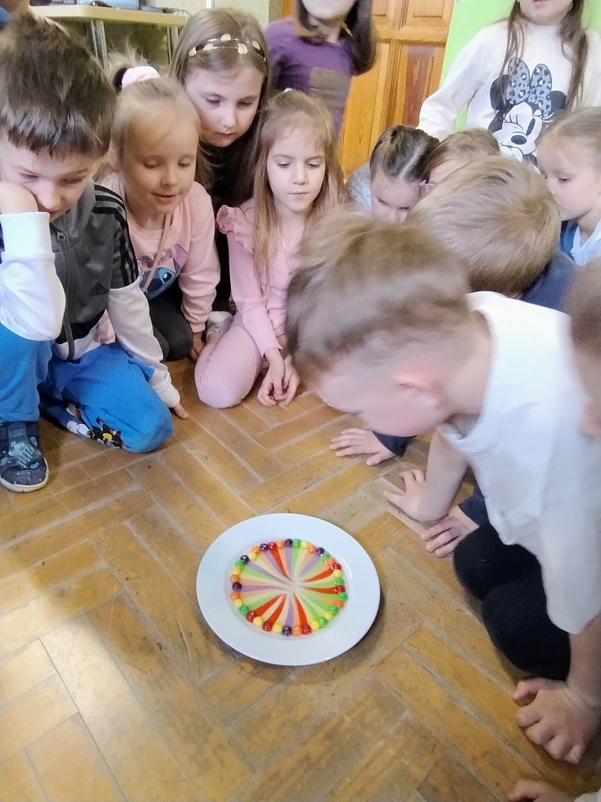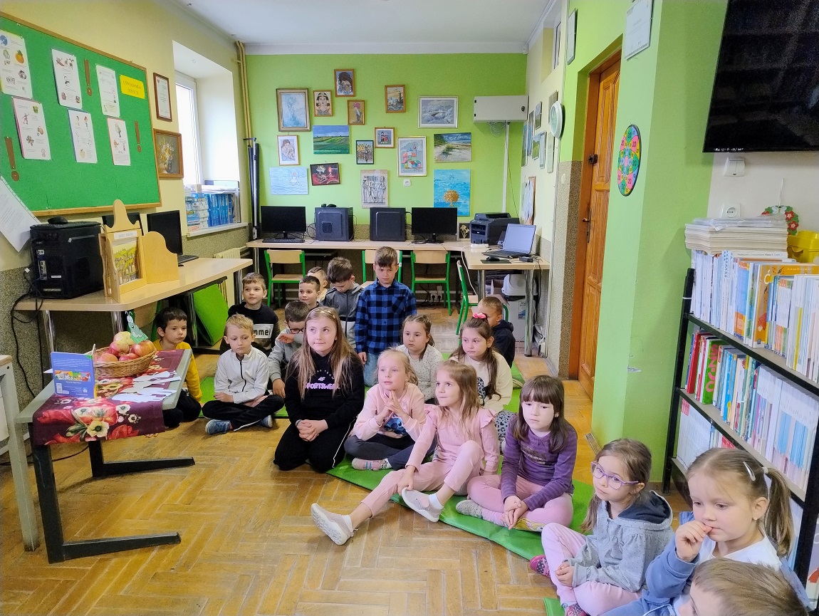 Kolorowy i pachnący tchnieniem wiosny świat odkryły dzieci z przedszkolnej grupy „O” podczas spotkania w szkolnej bibliotece. Uczennice z klasy VII: Anna i Małgorzata w atrakcyjny sposób zaprezentowały literaturę dziecięcą, ukazującą świat kolorów między innymi w wierszach  Marii Konopnickiej, Jana Brzechwy czy Juliana Tuwima. Dzieci udowodniły znajomość  kolorów odpowiadając na niełatwe zagadki, obejrzały inscenizację wiersza  „Entliczek – pentliczek w wykonaniu starszych koleżanek, a eksperymenty z kolorami powiodły ich do otaczającego nas świata, ukazanego w wierszach dla dzieci.