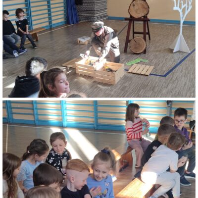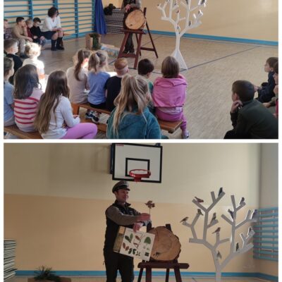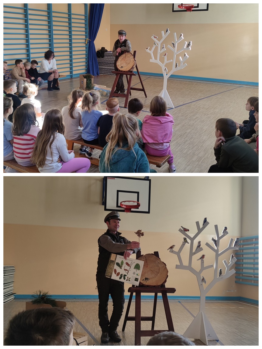 Podczas wizyty dzieci miały okazję poznać fascynujący świat lasu oraz poszerzyć swoją wiedzę przyrodniczą. Gość w przystępny i angażujący sposób opowiedział o ptakach występujących w naszych lasach, ucząc uczniów ich rozpoznawania, a także przybliżył informacje o drzewach liściastych i iglastych. Szczególne zainteresowanie wzbudziła prezentacja dotycząca wieku drzew – dzieci dowiedziały się, jak prawidłowo liczyć słoje i określać, ile lat ma drzewo.