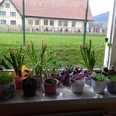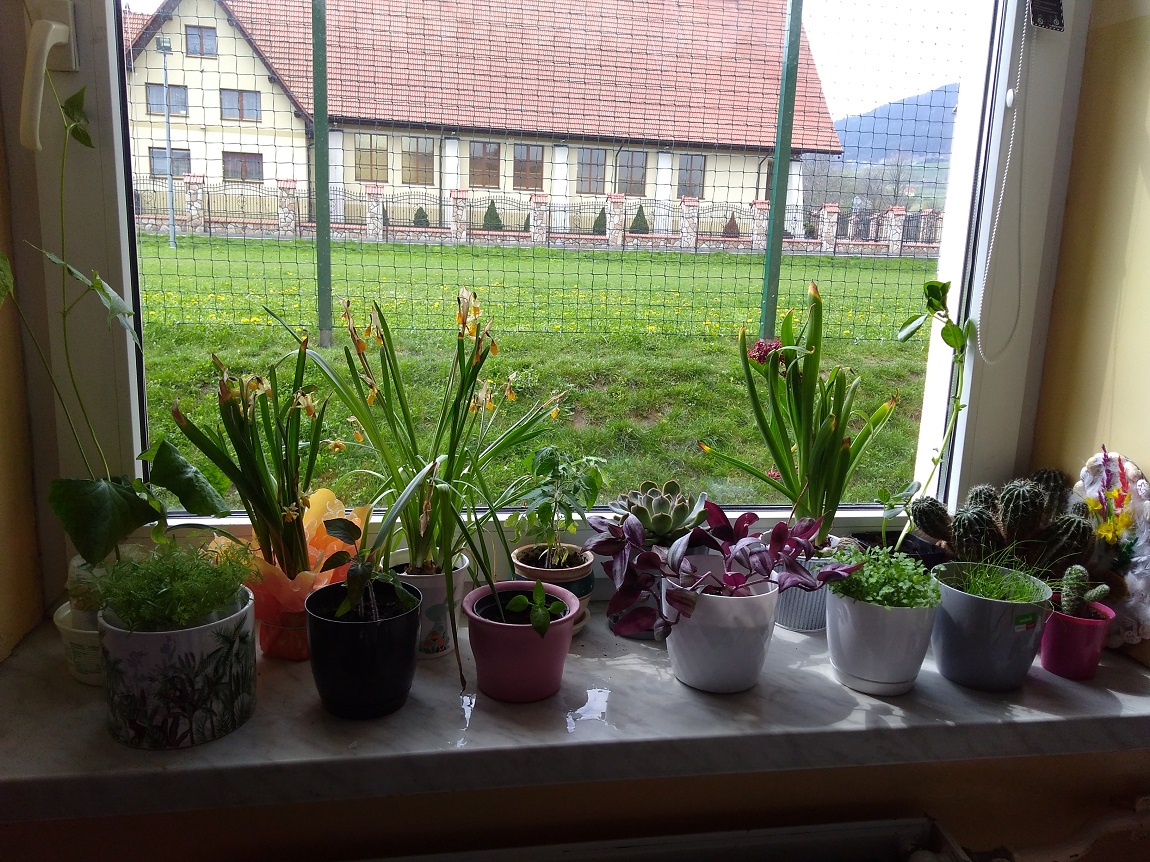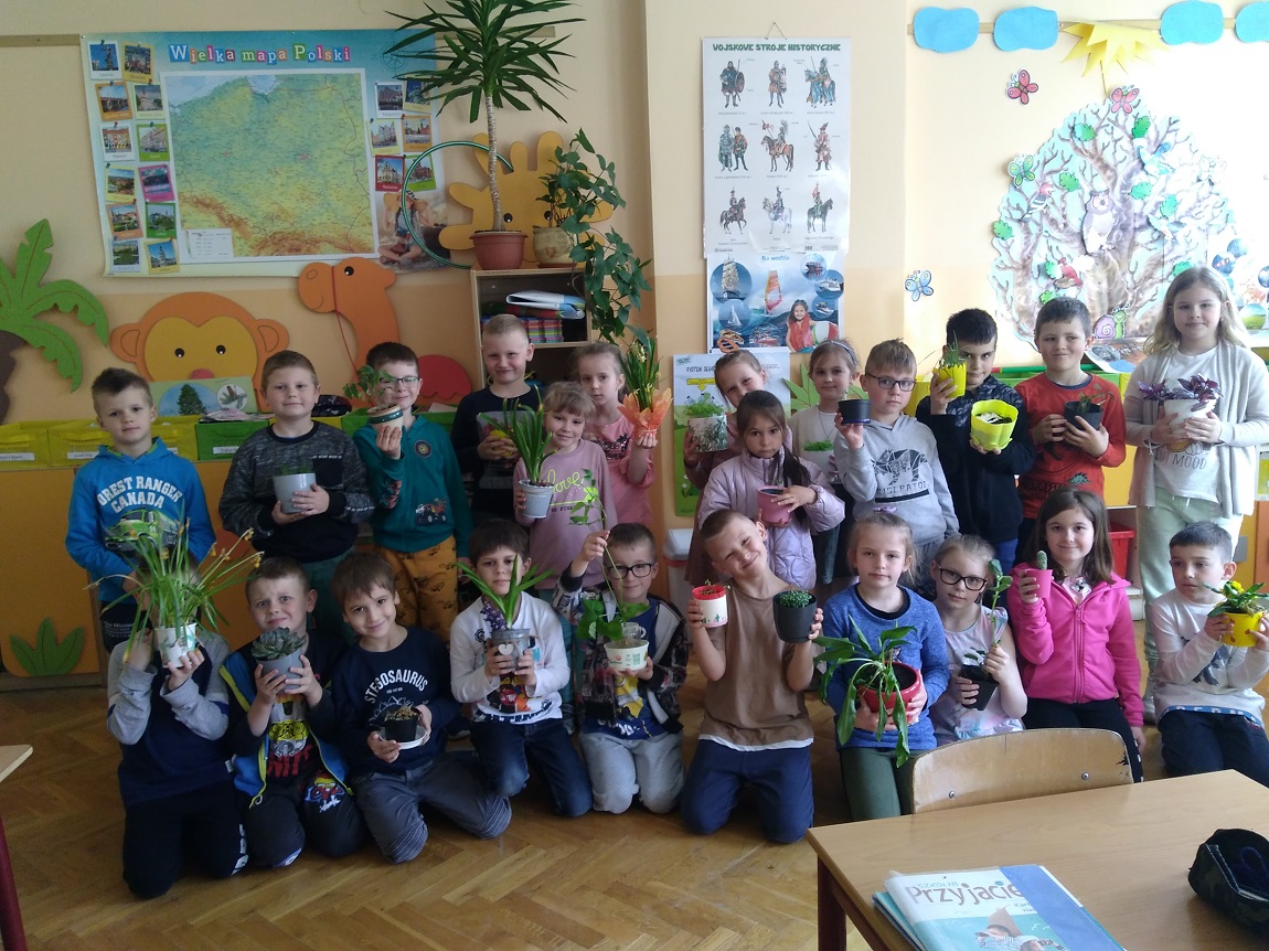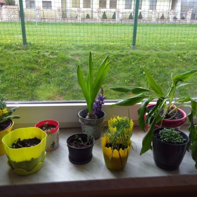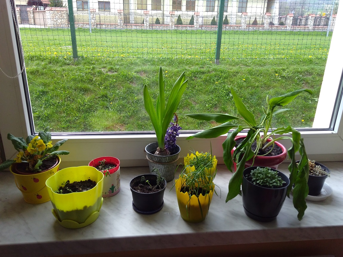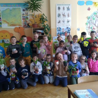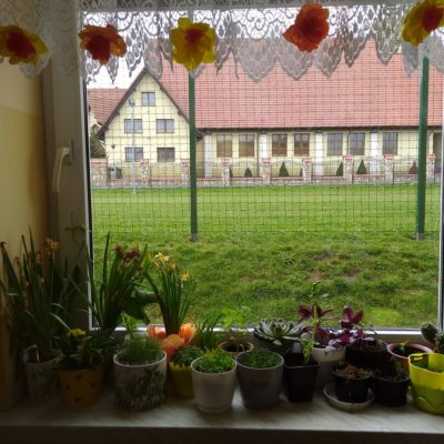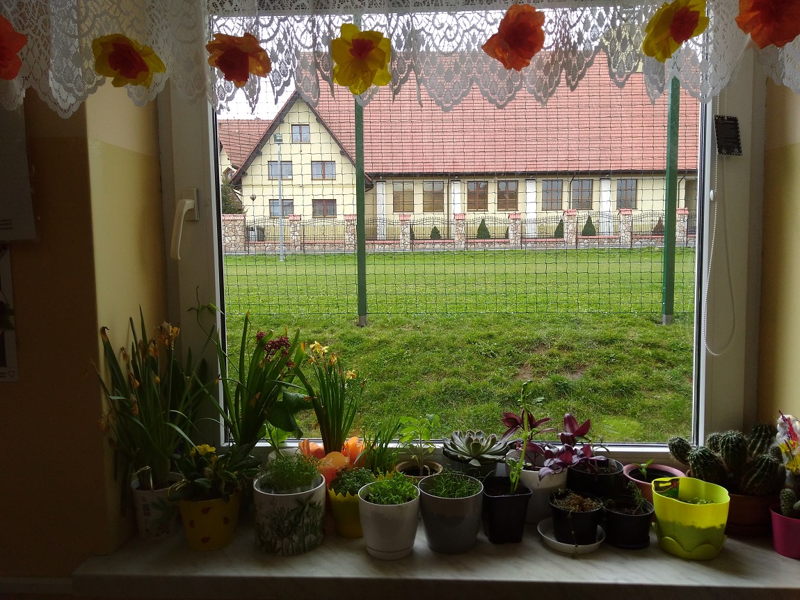 Uczniowie kl. I w kwietniu założyli „ogródek” na parapecie w klasie. Przynieśli roślinki, dbali o nie i obserwowali ich wzrost. Najwięcej zasiali warzyw, ale są też kwiatki. Nadal je pielęgnują a roślinkom chyba dobrze służy szkolny parapet.