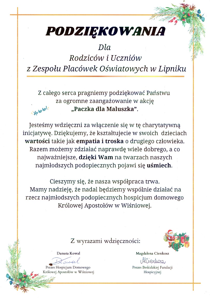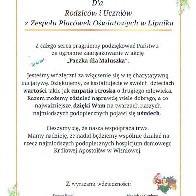 Wolontariusze naszej szkoły włączyli się w akcję ” Paczka dla Maluszka”, która trwała do 20 listopada. W ramach tej inicjatywy zbieraliśmy zabawki, pomoce szkolne, słodycze i środki higieniczne aby przygotować paczki mikołajowe dla najmłodszych podopiecznych Beskidzkiej Fundacji Hospicyjnej. Udało się nam zebrać ogromną ilość rzeczy, które przekazaliśmy fundacji.