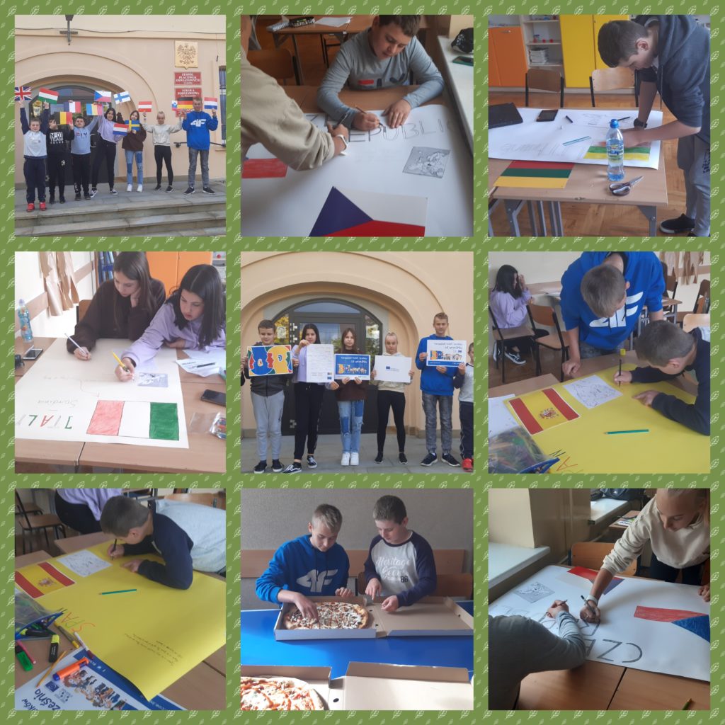 W dniu 16 października, po długiej przerwie spowodowanej pandemią, odbyły się stacjonarne zajęcia z projektu Erasmus +. Ze względu na zaistniałą sytuację konieczny stał się nabór chętnych do współpracy z naszymi partnerskimi szkołami. Dlatego na pierwszych zajęciach powitaliśmy uczniów z klasy V i VI. Wspólnie odświeżyliśmy wiadomości o szkołach, z którymi współpracujemy, tworząc plakaty poświęcone Czechom, Hiszpanii, Litwie, Szwecji i Włochom. Następnie omówiliśmy zakres naszych działań w ramach tematyki projektu „CIRCULAR ECONOMY AND SUSTAINABLE TOURISM OUR DEMOCRATIC CHOICE FOR THE FUTURE EUROPE” , który poświęcony jest ekologii, ochronie środowiska oraz turystyce. Wstępnie zapoznaliśmy się z zadaniami planowanymi do wykonania w tym roku szkolnym. Najwięcej emocji wzbudziła perspektywa wyjazdów za granicę. Czekają nas wyjazdy do Włoch, Czech i na Litwę a w następnej kolejności zaprosimy gości do siebie. Dlatego też wstępnie określiliśmy warunki wyjazdu i przyjmowania dzieci zza granicy. Spotkanie pełne emocji zostało zakończone wspólnym posiłkiem – pizzą, która wywołała dyskusję na temat słonecznych Włoch oraz wspomnień z pobytu w Hiszpanii.