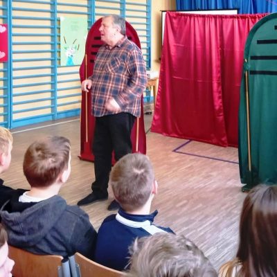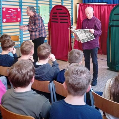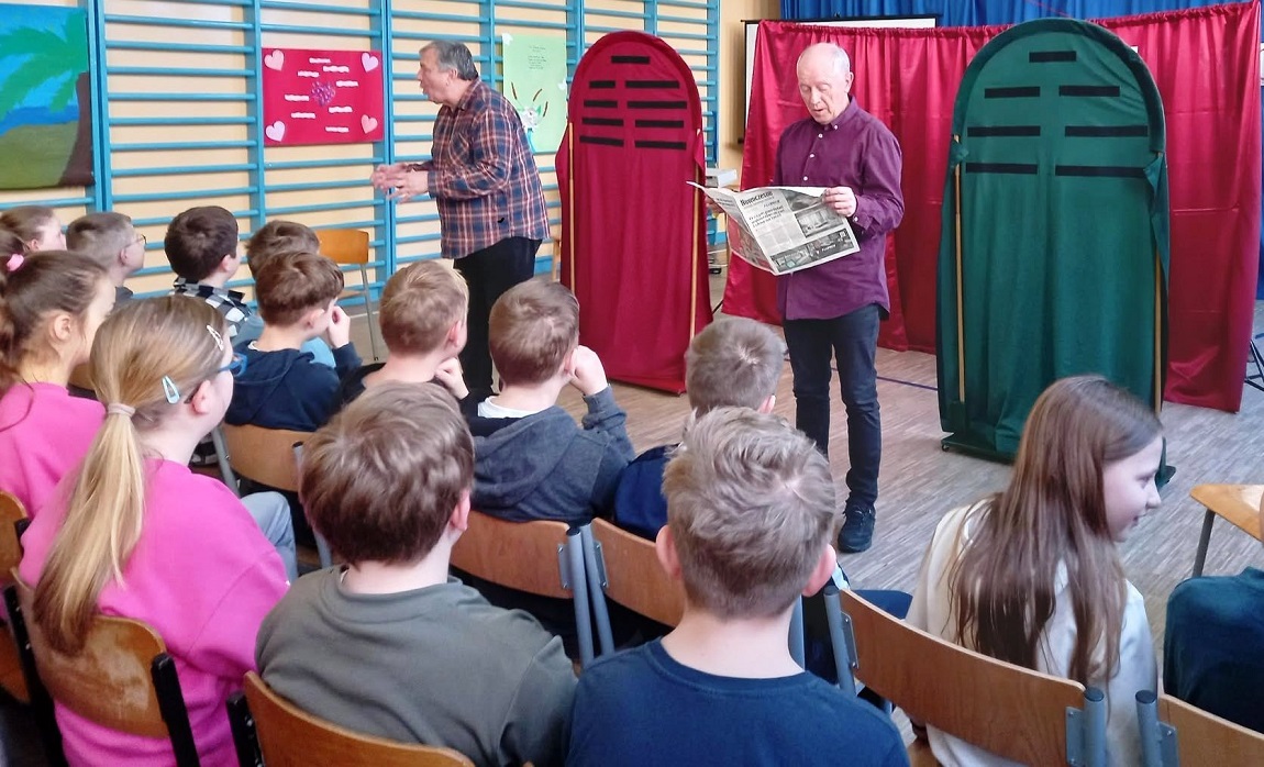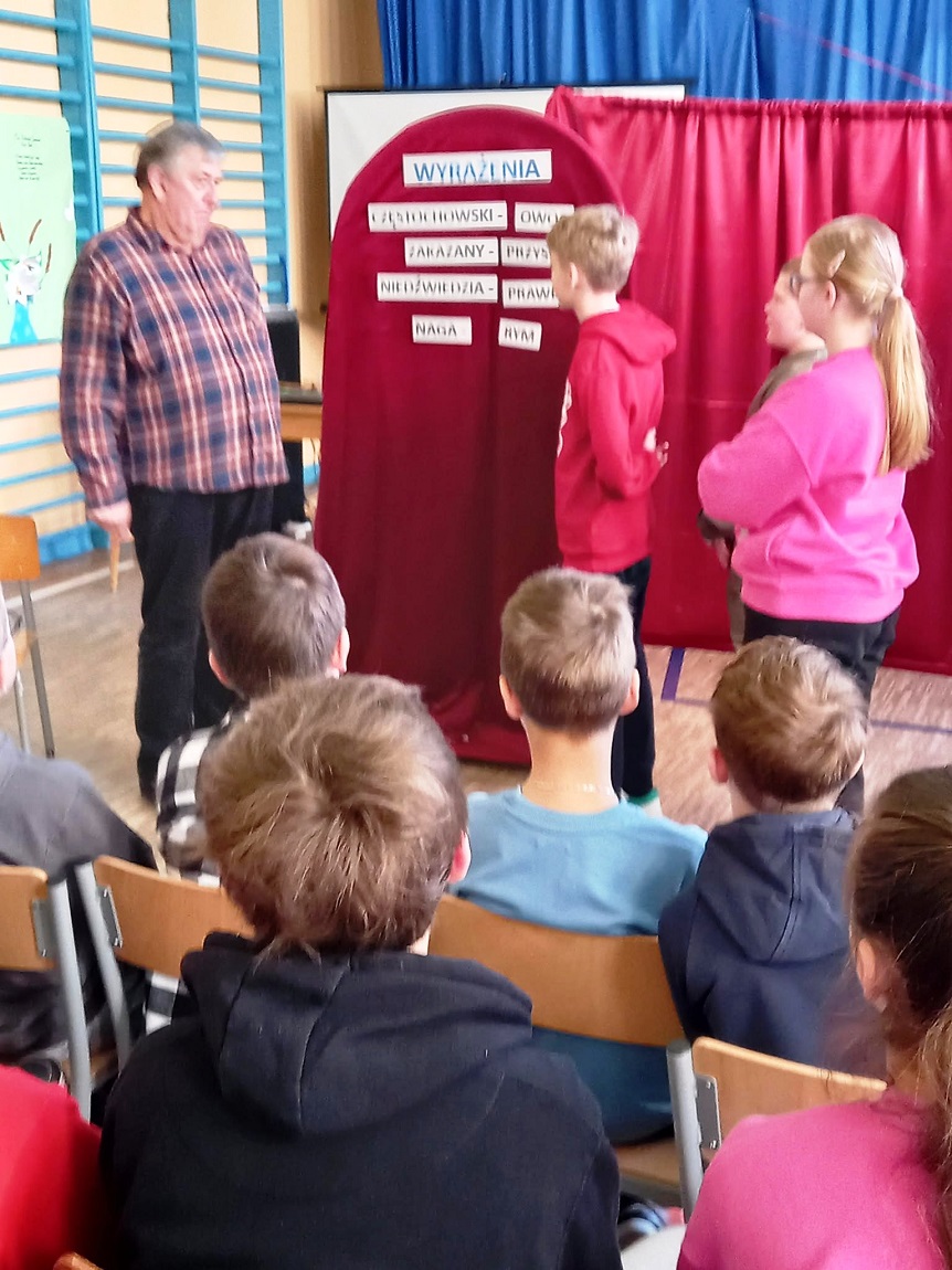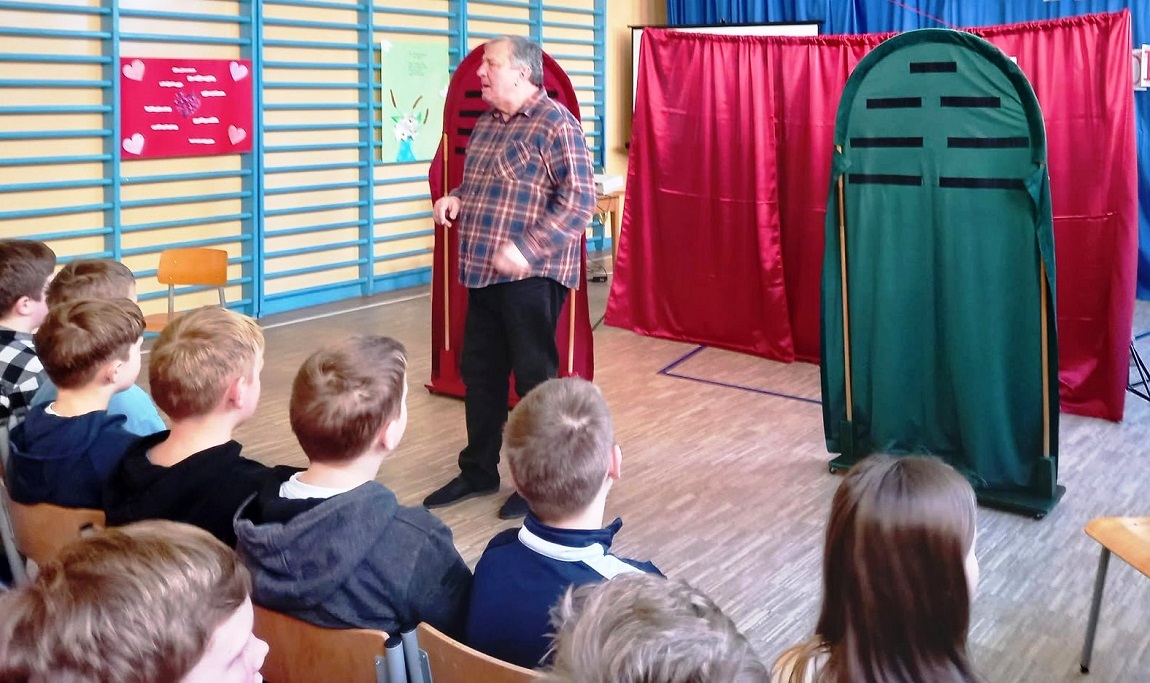 20 marca b.r. gościliśmy w naszej szkole artystów scen krakowskich – Wojciecha Habelę i Jacka Leczmara z Agencji Artystycznej PRO ART. – KRAK. Aktorzy w niekonwencjonalny sposób przybliżyli widzom związki frazeologiczne oraz źródła ich pochodzenia. Przedstawienie odbyło się z czynnym udziałem naszych uczniów, a całość występów widownia nagrodziła gromkimi brawami.