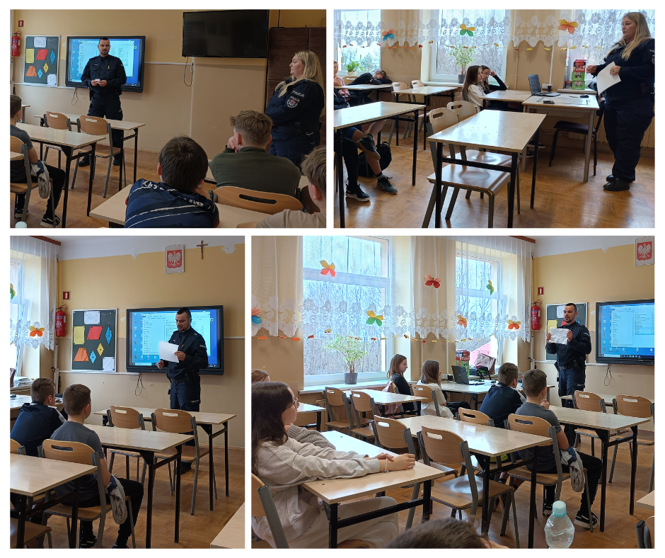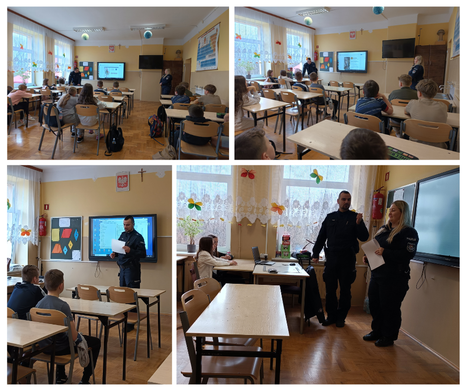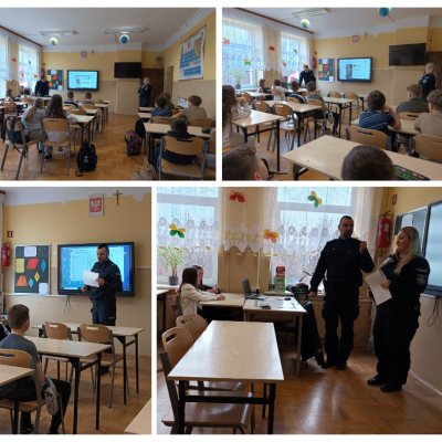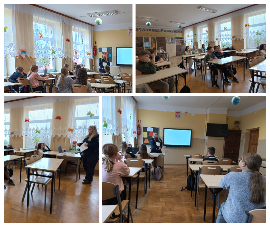 W dniu 14 marca 2025r uczniowie klasy szóstej brali udział w spotkaniu z przedstawicielami policji Panią Dzielnicową sierż. Sztab. Agnieszkę Buda-Zembol oraz Zastępcą Komendanta Komisariatu Policji w Dobczycach Panem podkomisarzem Tomaszem Wajdą. Tematem pogadanki była odpowiedzialność prawna nieletnich. Szczególną uwagę poświęcono tematyce sposobów i metod przeciwdziałania przemocy i agresji wśród młodych ludzi oraz zagrożeń stosowania energetyków, e-papierosów i innych używek. Poruszany był także temat tzw. cyberprzemocy i skutków jakie może nieść za sobą niewłaściwe korzystanie z Internetu. Na spotkaniu uczniowie dowiedzieli się, jakie mają prawa i obowiązki w świetle prawa, kto i kiedy ponosi odpowiedzialność prawną. Prowadzący pogadankę uświadomili uczniom, że mają prawo czuć się bezpiecznie w domu, w szkole i na ulicy. Na co dzień mogą liczyć na pomoc ludzi i organizacji, które są do tego powołane.