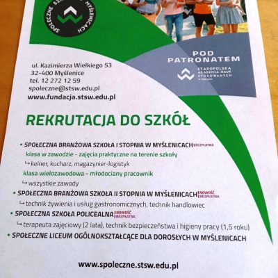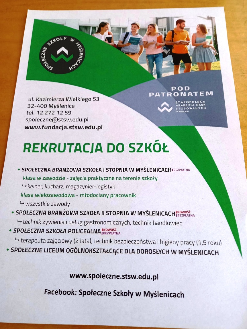 W dniu 4.03.b.r. uczniowie klasy ósmej spotkali się z p. mgr Wiesławą Bień – pedagogiem spec. i nauczycielką j. niemieckiego w Społecznej Szkole w Myślenicach. Szkoła działa pod patronatem Staropolskiej Akademii Nauk Stosowanych w Kielcach, obecnie jest prowadzona przez Fundację WWW.spoleczne.stsw.edu.pl . Absolwenci klasy ósmej mogą się kształcić w Społecznej Branżowej Szkole I, następnie II Stopnia, a w przyszłości w Społecznej Szkole Policealnej oraz Społecznym Liceum Ogólnokształcącym dla Dorosłych. Jest to szkoła bezpłatna.