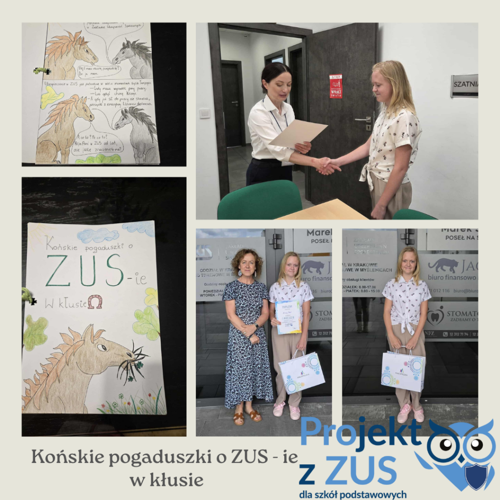 W dniu 24 czerwca 2025r. uczennica klasy 7a Milena Bajer została zaproszona wraz z mamą i p. Kucałą do Zakładu Ubezpieczeń Społecznych w Myślenicach, gdzie otrzymała z rąk Pani Beaty Podmokłej – Kierownika Biura Terenowego ZUS nagrodę i dyplom za zdobycie I miejsca w wojewódzkim etapie ogólnopolskiego konkursu „Projekt z ZUS”. Zadanie konkursowe polegało na wykonaniu plakatu, komiksu lub nagraniu filmu, który wyjaśnia, dlaczego ubezpieczenia społeczne są ważne. Milena zainspirowana lekcją o ubezpieczeniach społecznych prowadzoną przez pracownika ZUS w Krakowie Panią Monikę Suder przygotowała komiks pt. „Końskie pogaduszki o ZUS – ie w kłusie”, w którym przekonuje, że warto się w życiu ubezpieczać. Praca nad komiksem była dla Mileny ciekawym doświadczeniem. Dodatkowo cieszy fakt, że konkurs ten jest wpisany na listę konkursów kuratoryjnych.