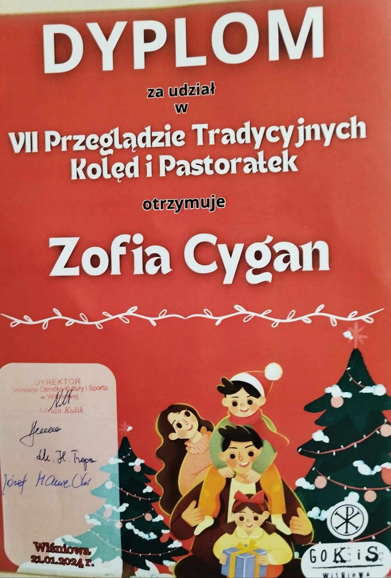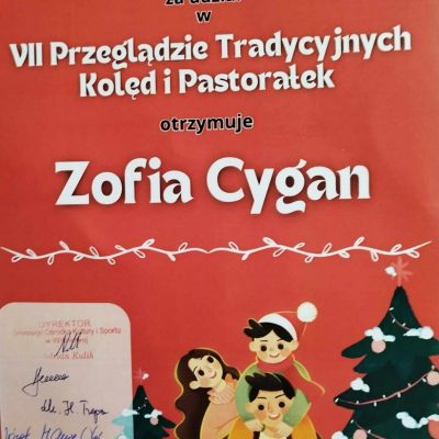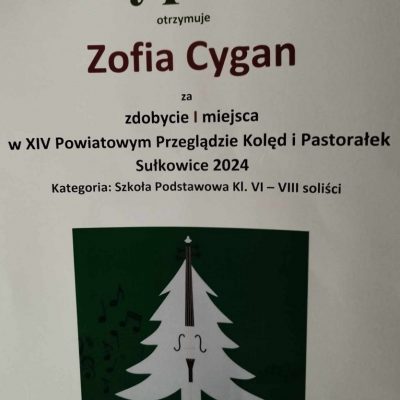W dniu 17 stycznia 2024 r. uczennica klasy 6b Zofia Cygan brała udział w XIV Powiatowym Przeglądzie Kolęd i Pastorałek w Sułkowicach i zdobyła tam zaszczytne I miejsce. Kilka dni później, 21 stycznia, Zofia uczestniczyła także w VII Przeglądzie Tradycyjnych Kolęd i Pastorałek w Wiśniowej. To kolejne sukcesy uczennicy, która z wielką pasją i zaangażowaniem reprezentuje szkołę w różnego rodzaju przeglądach i konkursach wokalnych.