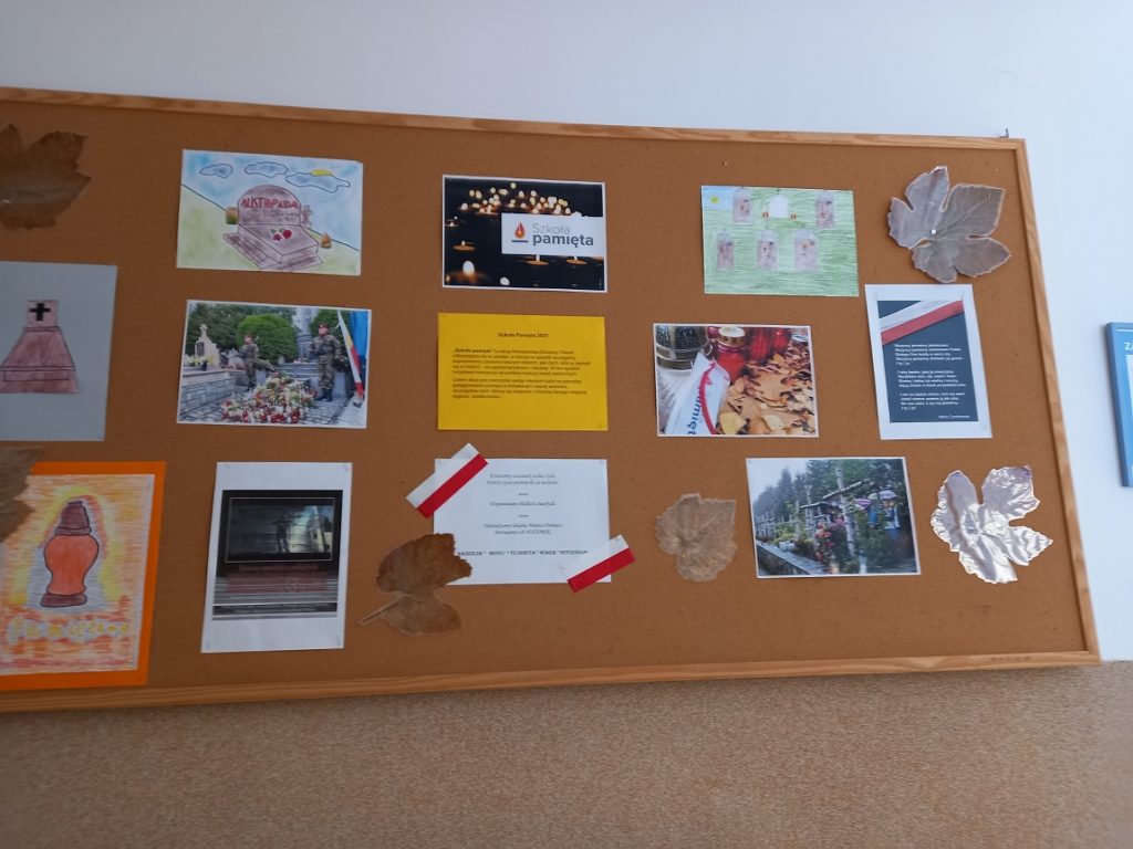 Na korytarzu szkolnym na gazetce ściennej uczniowie z SU zamieścili informacje dotyczące ogólnopolskiej akcji MEN Szkoła Pamięta oraz zdjęcia i rysunki o tematyce patriotycznej i związanej ze Świętem Zmarłych oraz Dniem Zadusznym.