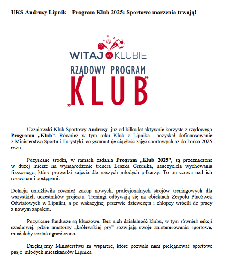 UKS Andrusy Lipnik – Program Klub 2025: Sportowe marzenia trwają! 21 września 2025 Urszula Kucała T. Górka 24459 none none true true true Close Next Previous The requested content cannot be loaded. Please try again later.