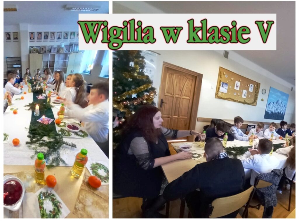 W dniu 19 grudnia uczniowie klasy V uczestniczyli we wspólnej, klasowej wigilii. Na tę uroczystość sala nr 4 została udekorowana motywami świątecznymi. Przy odświętnie nakrytym stole wszyscy odmówili modlitwę, łamali się opłatkiem i kolędowali. Na wigilijnym stole nie zabrakło tradycyjnego, wigilijnego dania czyli barszczu czerwonego z uszkami. Przedstawiciele SU z kl. V wręczyli P. Dyrektorowi stroik i złożyli życzenia świąteczne oraz noworoczne.