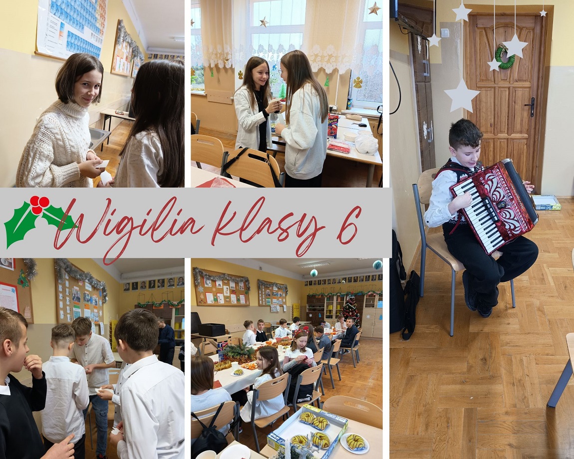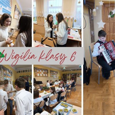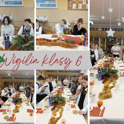 W takiej serdecznej, rodzinnej atmosferze klasa 6 spędzała piątkowy dzień w szkole. Przy pięknie ustrojonym stole, przy świątecznych stroikach, przy barszczu z uszkami i słodkim poczęstunku wszyscy zasiedli do wieczerzy wigilijnej. Wspólne śpiewanie kolęd, łamanie się opłatkiem i gra Ksawerego na akordeonie wprowadziła wszystkich w ten wyjątkowy czas.