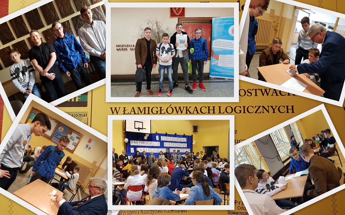 W dniu 25 kwietnia 2019r. czterech uczniów naszej szkoły: Norbert Wąsowicz, Grzegorz Twardosz, Olaf Bogacz i Piotr Tokarz wzięło udział w „X Jubileuszowych Małopolskich Mistrzostwach w Łamigłówkach Logicznych”, które odbyły się w Zespole Szkół Elektrycznych nr 2 w Krakowie. Podczas Mistrzostw uczniowie w czteroosobowych zespołach rozwiązywali liczbowe łamigłówki. W oczekiwaniu na wyniki uczniowie i nauczyciele wzięli udział w zajęciach popularyzujących matematykę prowadzonych przez dr Józefa Piórka z Uniwersytetu Jagiellońskiego „Matematyka bez matematyki” i dr Bronisława Pabicha „Reguła Guldina”. Nasi uczniowie wzięli udział w tych Mistrzostwach po raz pierwszy. Był to dla nich miło spędzony dzień wśród 196 rówieśników z 49 szkół z województwa małopolskiego.