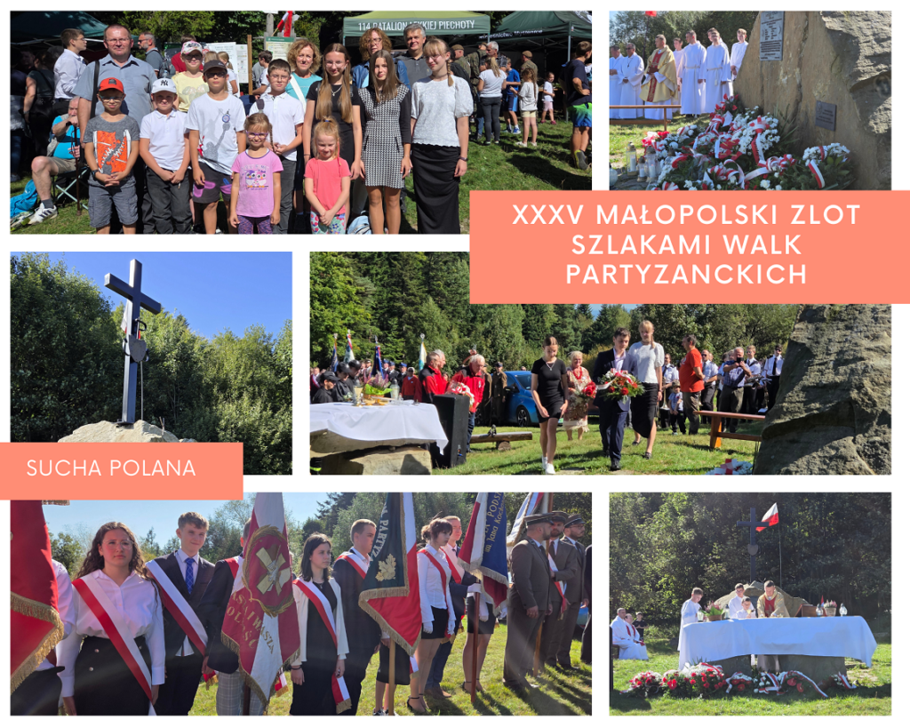 W dniu 20 września 2025r, dyrekcja, nauczyciele i uczniowie naszej szkoły uczestniczyli w uroczystej Mszy św. na Suchej Polanie, odprawionej przez proboszcza parafii w Lipniku księdza Piotra Pietruszkę w intencji partyzantów i poległych za Ojczyznę z udziałem pocztów sztandarowych. W bieżącym roku mija 81 rocznica krwawych wydarzeń i ciężkich walk partyzanckich w rejonie Łysiny. Organizatorzy XXXV Małopolskiego Zlotu Szlakami Walk Partyzanckich uczcili pamięć poległych i zmarłych partyzantów oraz pomordowanych mieszkańców okolicznych miejscowości. Oddali również hołd weteranom tych wydarzeń. Pod pomnikiem złożono wieńce i kwiaty oraz zapalono znicze. Piękna pogoda sprawiła, że na Suchej Polanie licznie zgromadzili się mieszkańcy Lipnika i okolicznych wsi oraz przedstawiciele władz lokalnych i samorządowych. Uczestnicy zlotu mogli posilić się pyszną pieczoną na ognisku kiełbaską i przekąskami przygotowanymi przez Koło Gospodyń Wiejskich w Lipniku, PTTK oddział „Lubomir” oraz Nadleśnictwo Myślenice.