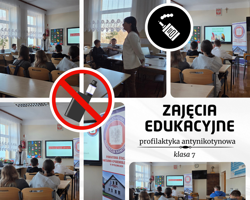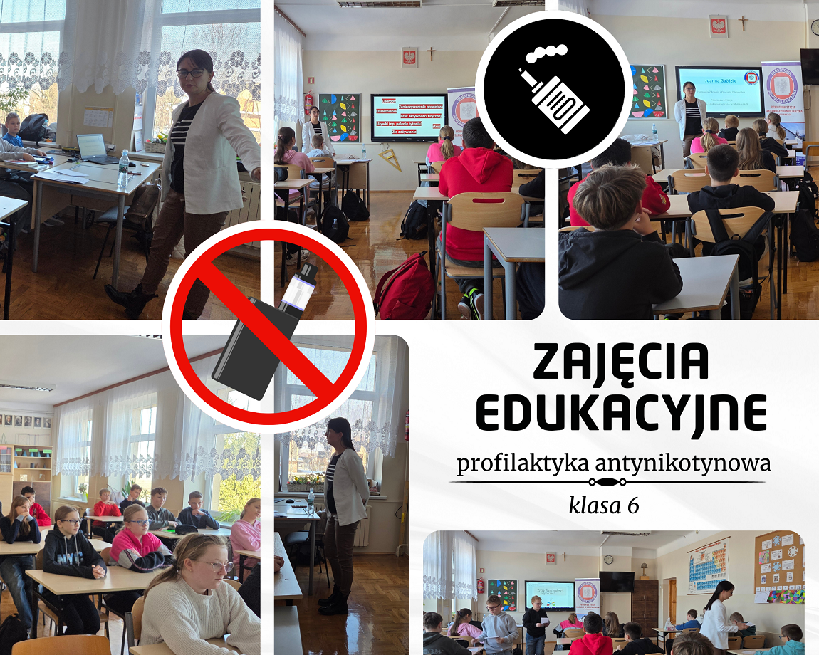 W dniu 28 listopada 2025r. uczniowie klasy VI i VII wzięli udział w zajęciach edukacyjnych prowadzonych przez Panią Joannę Gaździk – pracownika Powiatowej Stacji Sanitarno-Epidemiologicznej w Myślenicach. Uczniowie dowiedzieli się o zagrożeniach zdrowotnych związanych z czynnym i biernym paleniem papierosów, także e-papierosów. Uczniowie dowiedzieli się również jak szybko może dojść do uzależnienia od nikotyny wśród młodych ludzi. Pani Joanna uświadomiła uczniów jak ważne jest dbanie o zdrowie własne i swoich bliskich. Uczniowie poznali również korzyści życia bez nałogu tytoniowego.