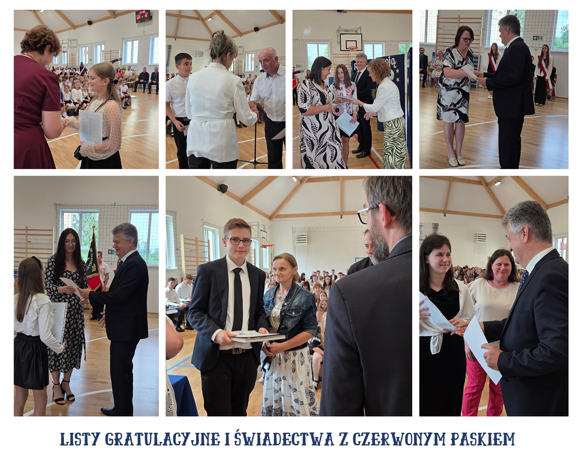 W dniu 27 czerwca 2025r. uczniowie Zespołu Placówek Oświatowych zakończyli rok szkolny 2024/25. O godzinie 8:15 odbyła się uroczysta Msza Święta, którą odprawił w intencji uczniów i nauczycieli ks. Proboszcz Piotr Pietruszka. Po Mszy Świętej wszyscy udali się do sali gimnastycznej, gdzie Pan dyrektor Arkadiusz Skiba przywitał Wójta Gminy Pana Bogumiła Pawlaka, nauczycieli, pracowników szkoły, rodziców i uczniów. Wszystkim podziękował za cały rok nauki i pracy. Podziękowania i życzenia złożył również Pan Wójt Bogumił Pawlak, Przewodnicząca Rady Rodziców Pani Klaudia Woźniczka i przedstawicielka Samorządu Uczniowskiego Martyna Kłobuch.
