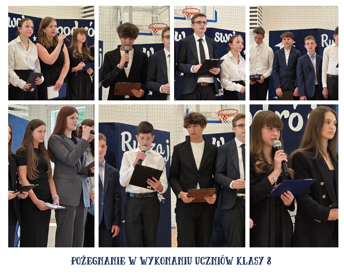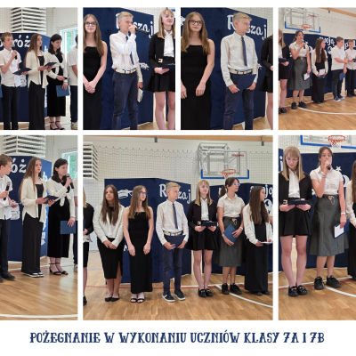 Po rozdaniu nagród uczniowie klasy 7a i 7b pożegnali swoich starszych kolegów. Następnie uczniowie klasy ósmej zaprezentowali pożegnalną część artystyczną, w której podziękowali dyrekcji, nauczycielom i pracownikom szkoły za 8 lat nauki i wychowania. Uczniowie klas siódmych wręczyli upominki kolegom i koleżankom z klasy ósmej. Były momenty wzruszeń i śmiechu.