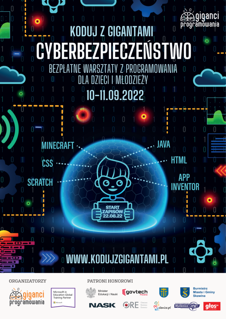 W imieniu organizatorów zapraszamy chętnych uczniów do wzięcia udziału w 11. edycji „Koduj z Gigantami” – bezpłatnych warsztatów z programowania dla dzieci i młodzieży, organizowanych przez Gigantów Programowania w ramach ogólnopolskiej, społecznej akcji edukacyjnej. Motywem przewodnim warsztatów będzie cyberbezpieczeństwo.