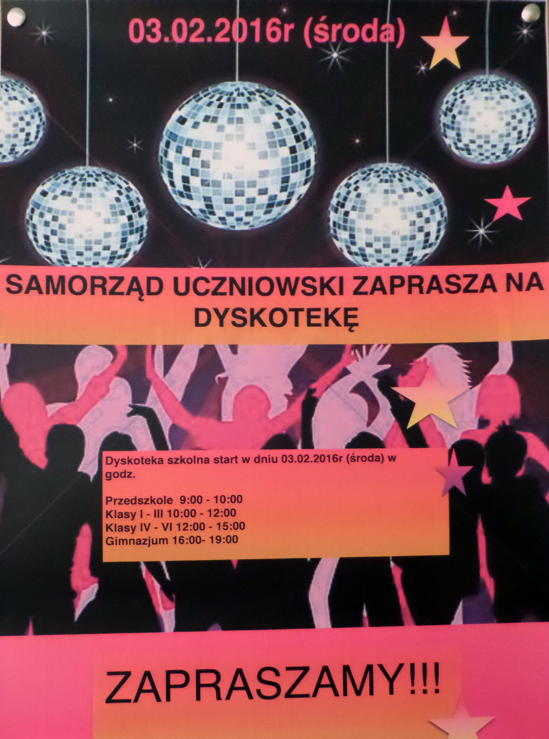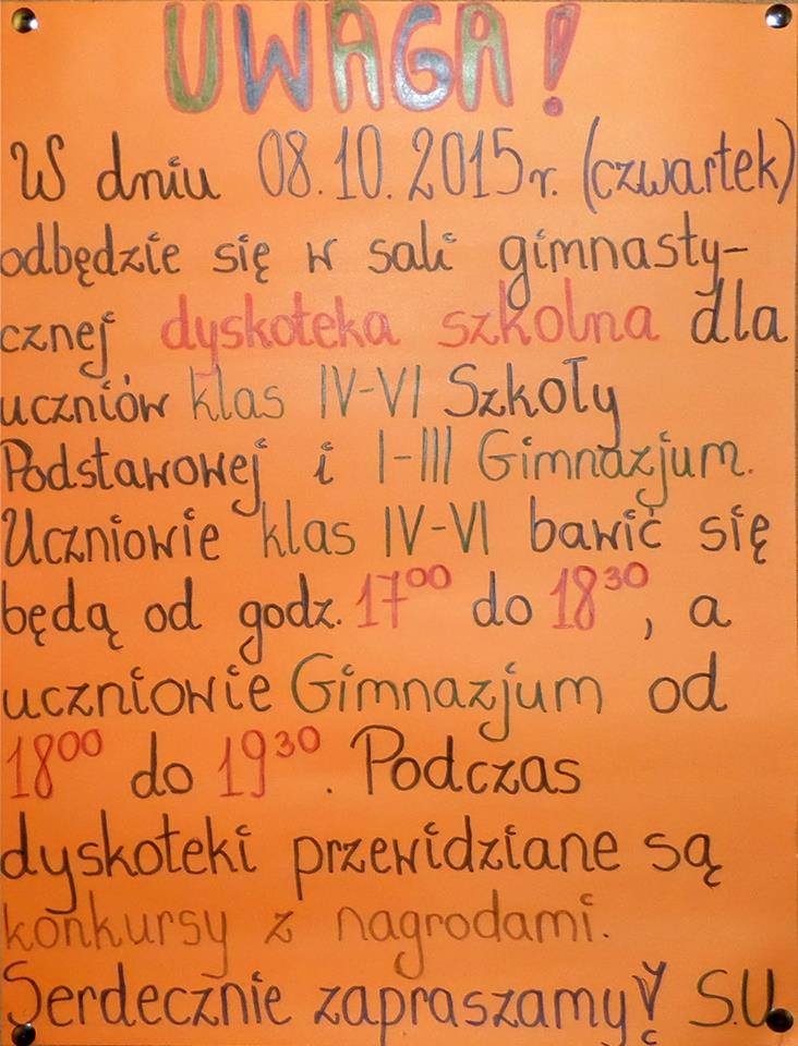 - zorganizował szkolną dyskotekę dla uczniów klas IV – VI Szkoły Podstwowej i I – III Gimnazjum.