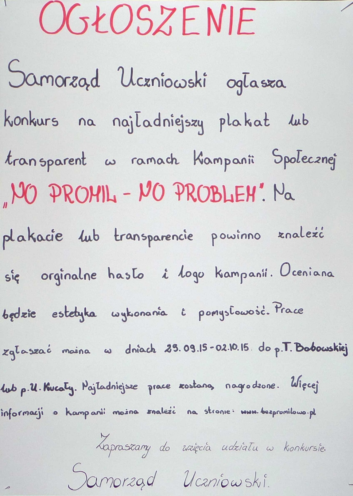 - ogłosił konkurs na najładniejszy plakta lub transparent w ramach Kampanii Społecznej „NO PROMIL – NO PROBLEM”,
