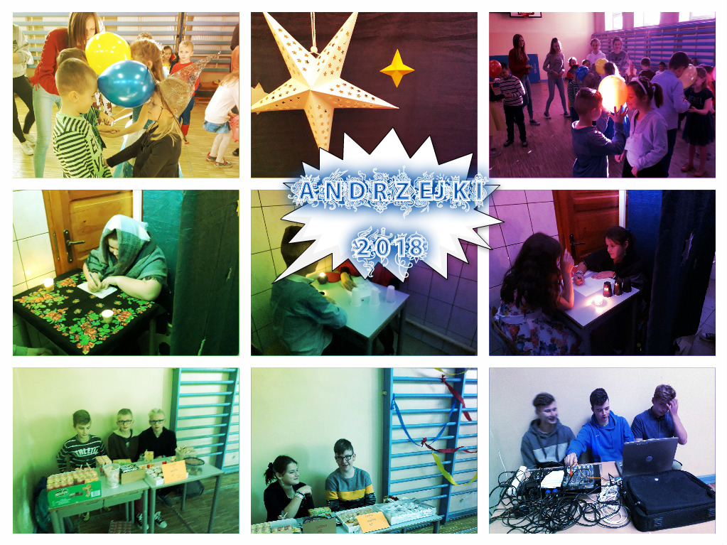 W dniu 29 listopada 2018 r. w naszej szkole odbyła się zabawa andrzejkowa. Uczniowie Samorządu Uczniowskiego zadbali o dekorację sali gimnastycznej. Przygotowali na ten dzień wróżby i konkursy z różnorodnymi nagrodami dla młodszych dzieci. Najpierw bawiły się przedszkolaki, następnie uczniowie kl. I – III,  IV – VI, a na końcu klasy VII, VIII i   gimnazjaliści. W ciągu całego dnia uczniowie z SU obsługiwali sprzęt muzyczny, przeprowadzali różnego rodzaju zabawy dla młodszych dzieci, sprzedawali ciasteczka z wróżbą oraz napoje i słodycze ( z czego dochód przeznaczony będzie na działalność SU).