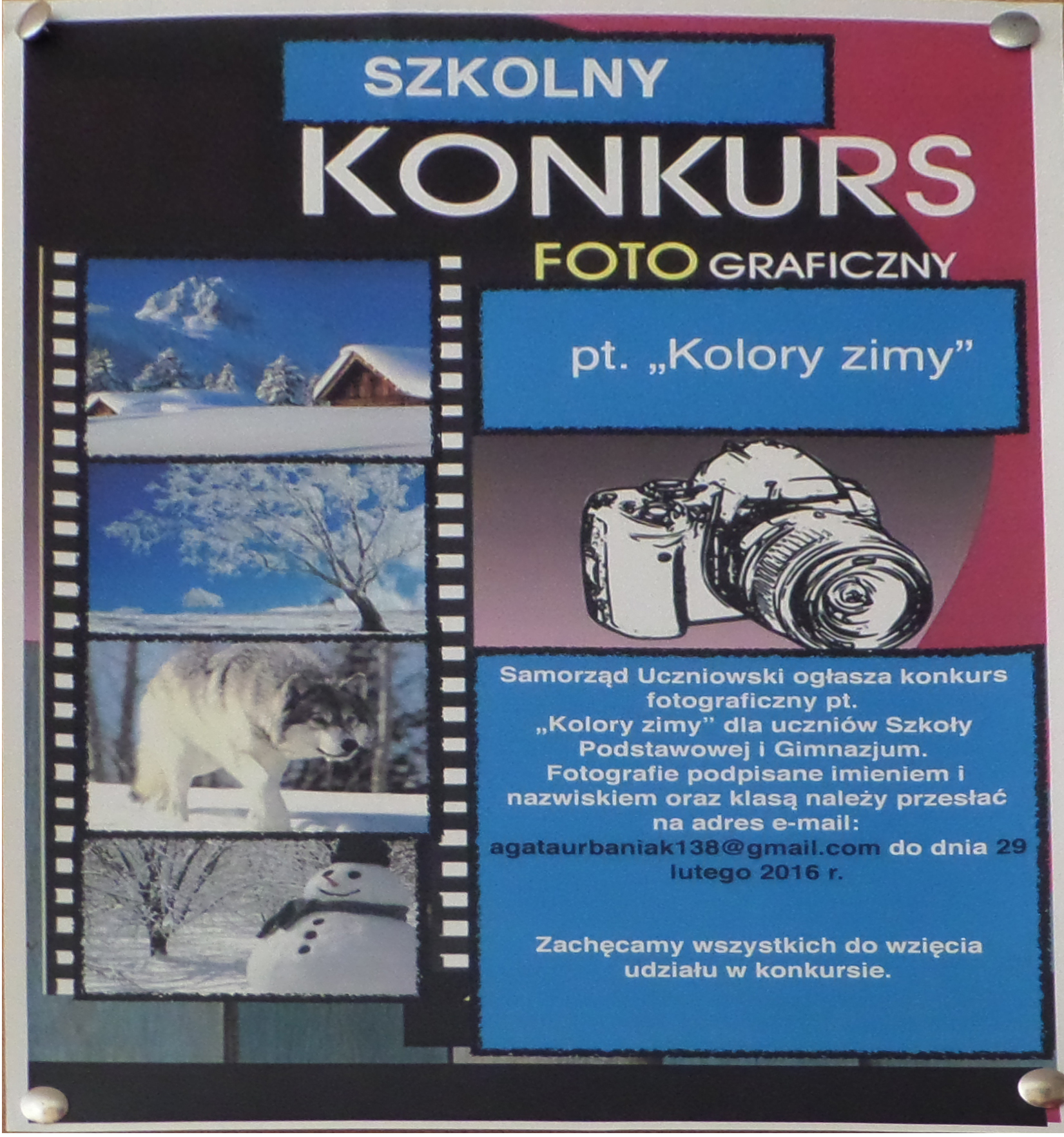 Samorząd Uczniowski w dniu 14.01.16r. ogłosił szkolny konkurs fotograficzny „Kolory Zimy” dla uczniów Szkoły Podstawowej i Gimnazjum. Fotografie należy przesyłać na adres e-mail podany na plakacie, które następnie umieszczane są na stronie SU na Facebooku. To zdjęcie, które otrzyma największą ilość lików wygra. Zachęcamy wszystkich do odwiedzenia naszej strony Samorząd Uczniowski na Facebooku i zagłosowania na swojego faworyta. Głosować można do 29 lutego. Szczegółowe informacje znajdują się na plakacie.