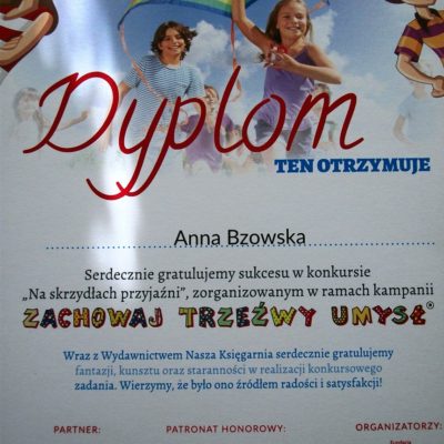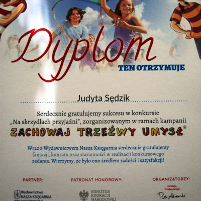 W ubiegłym roku szkolnym w ramach działań profilaktycznych przeprowadzonych pod hasłem akcji uczniowie naszej szkoły brali udział w konkursie literacko – plastycznym „Na skrzydłach przyjaźni”.