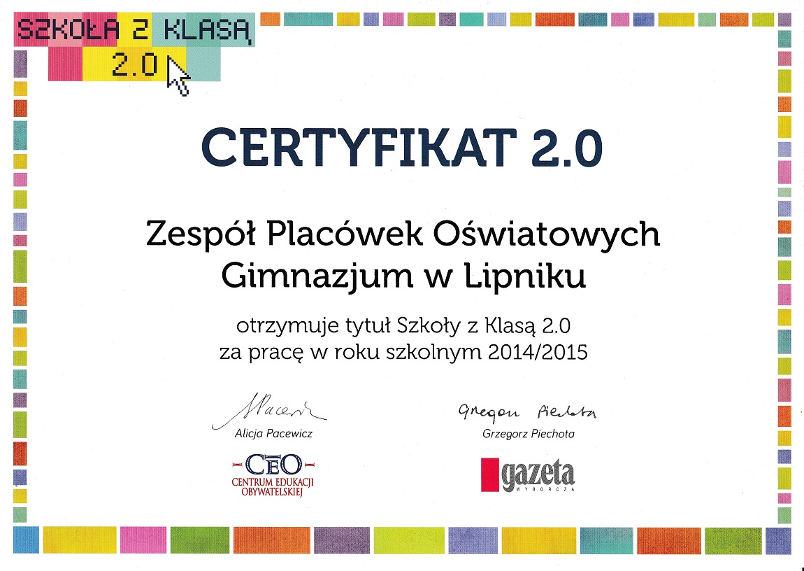 To był niezwykły rok – aktywny, kreatywny i pełen emocji dla ekipy 2.0: mgr inż. Arkadiusza Skiby – Dyrektora szkoły, mgr Anny Spytek – koordynatora programu, mgr Teresy Bobowskiej, mgr Urszuli Kucały, mgr Iwony Jasek – nauczycieli realizujących zadania nauczycielskie. Zdobycie Certyfikatu 2.0 jest uwieńczeniem naszych całorocznych starań, ogromu pracy, wysiłku i wiary w możliwości uczniów i nauczycieli. Dziękuję!