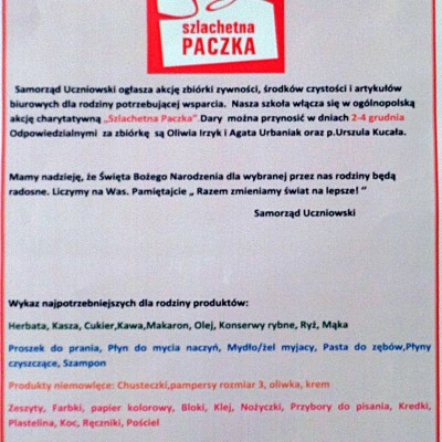 Nasza szkoła włącza się w ogólnopolską akcję charytatywną „Szlachetna Paczka”. W dniu 21.11.2015r. wybraliśmy Rodzinę, która otrzyma w tym roku paczkę przygotowaną przez naszych uczniów. W tym celu w dniach 2 – 4 grudnia Samorząd Uczniowski przeprowadzi zbiórkę produktów spożywczych, chemicznych i papierniczych dla wybranej Rodziny. Bardzo prosimy, aby wszyscy uczniowie aktywnie włączyli się w akcję. Lista produktów i szczegółowe informacje znajdują się na plakacie. Mamy nadzieję, że Święta Bożego Narodzenia dla wybranej przez nas Rodziny będą radosne i szczęśliwe. Pamiętajcie „Razem zmieniamy świat na lepsze!”.